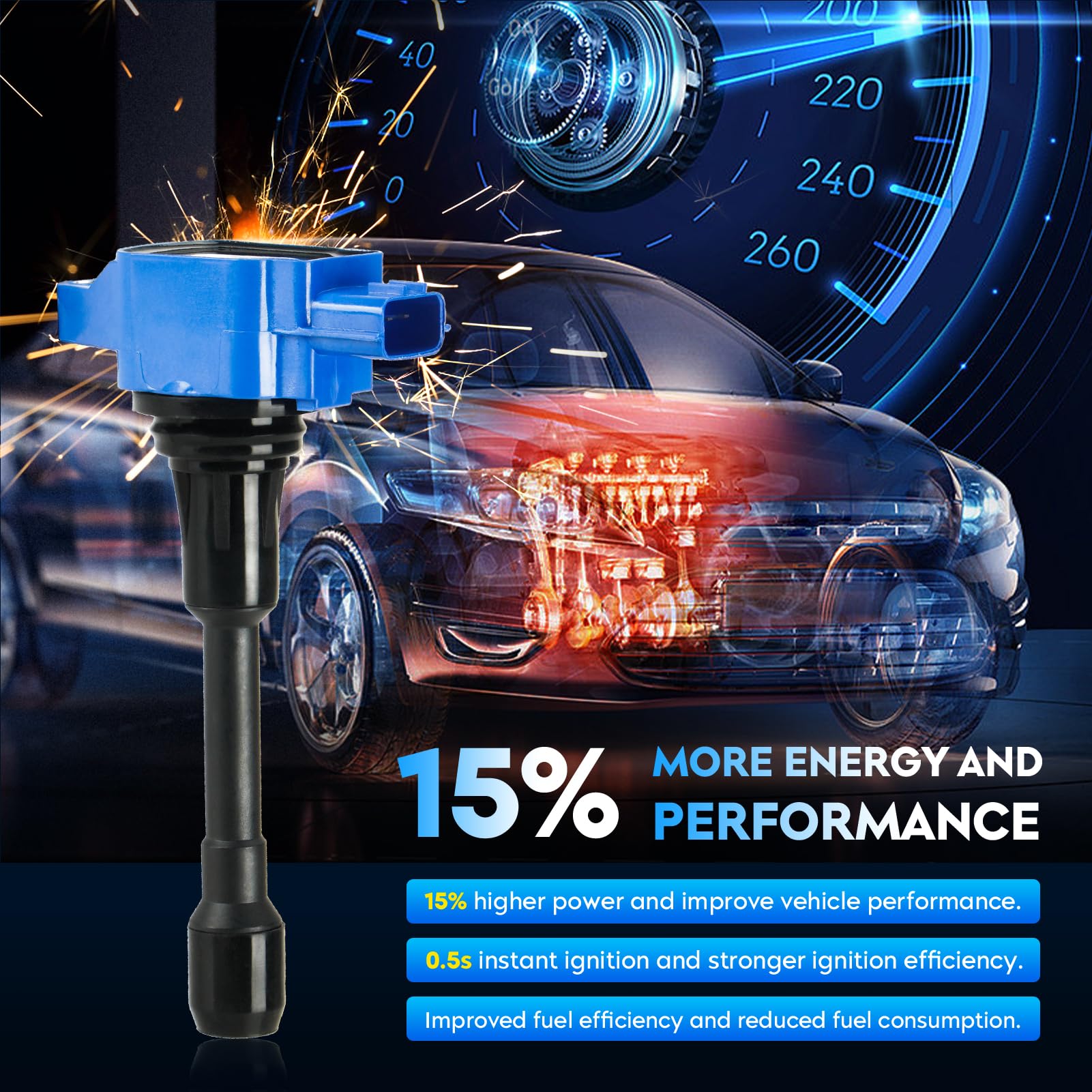 Conjunto de 4 bobinas de encendido de rendimiento premium para varios modelos de Infiniti y Nissan. Compatible con una amplia gama de vehículos y diseñado para mejorar el rendimiento del motor.