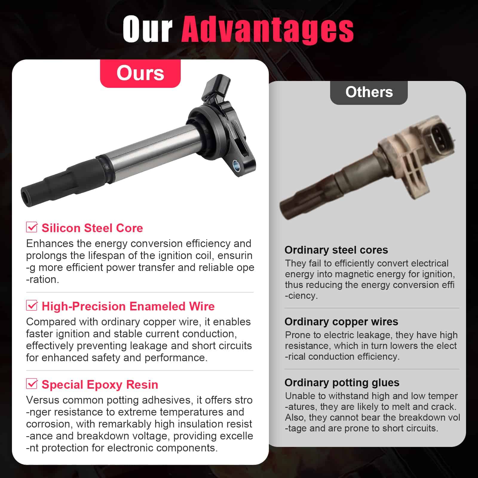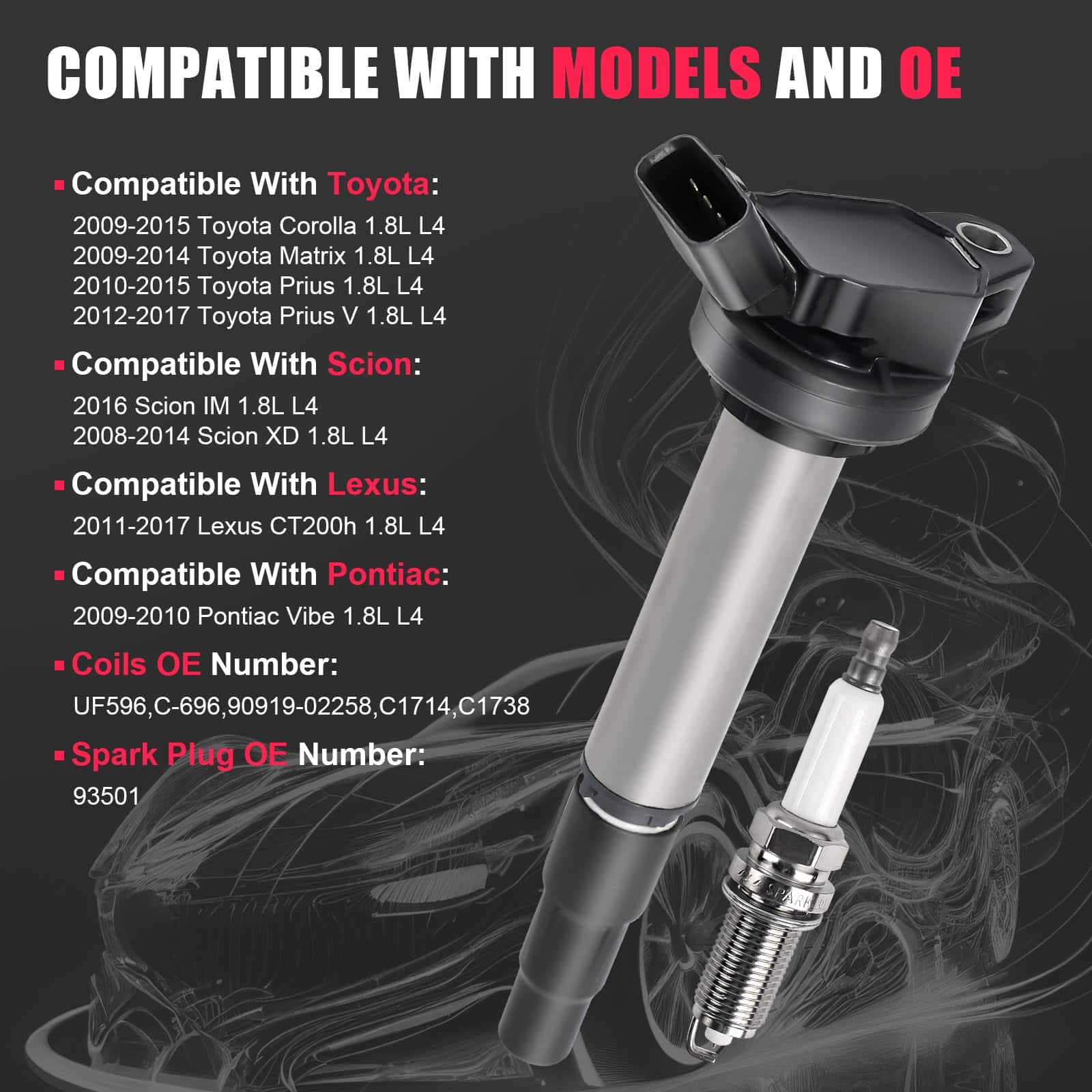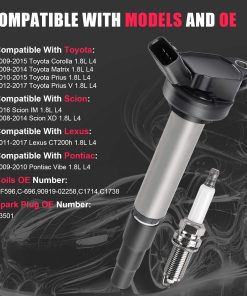 1. Compatible con: Conjunto de bobina de encendido y bujía para: Toyota Corolla 1.8 L4 2009-2015 | Toyota Prius 1.8L L4 2010-2015 | Toyota Matrix 1.8L L4 2009-2014 | Scion xD 1.8 L4 2008-2014 | Pontiac Vibe 1.8 2009-2010. Consulte la descripción del producto para obtener una comprensión más detallada. 2. Números de parte de reemplazo: Reemplaza UF596, C-696, 90919-02258, C1714, C1738. ¡Verifique la compatibilidad con su vehículo! 3. Bujía: Actualice el sistema de encendido de su motor con nuestra excepcional bujía de doble iridio. Con una vida útil significativamente más larga de hasta 100,000 kilómetros, puede disfrutar de una chispa constante y estable que mantiene su motor funcionando en todos los cilindros. Reemplaza 93501. 4. Excelente funcionamiento: Después de aproximadamente 50,000 kilómetros de conducción, es posible que sus bobinas comiencen a mostrar signos de envejecimiento, lo que podría provocar fallos en el motor, ralentí áspero, disminución de la potencia y mala economía de combustible. Nuestras bobinas meticulosamente diseñadas y actualizadas están diseñadas para superar los estándares OEM, garantizando una instalación sin esfuerzo y mejorando drásticamente el rendimiento. Experimente unas capacidades excepcionales de arranque en frío y un funcionamiento más suave del motor. 5. Garantía de 24 meses: Descubra la tranquilidad que brinda nuestra excepcional garantía de 24 meses. En TXROMTZ, respaldamos por completo nuestros productos. Si, por algún motivo, no está totalmente satisfecho con nuestras bobinas de encendido, no dude en contactarnos por mensaje. Estamos comprometidos a ofrecerle una experiencia sin complicaciones, ofreciendo reemplazos o reembolsos sin problemas. Su satisfacción es nuestra máxima prioridad.