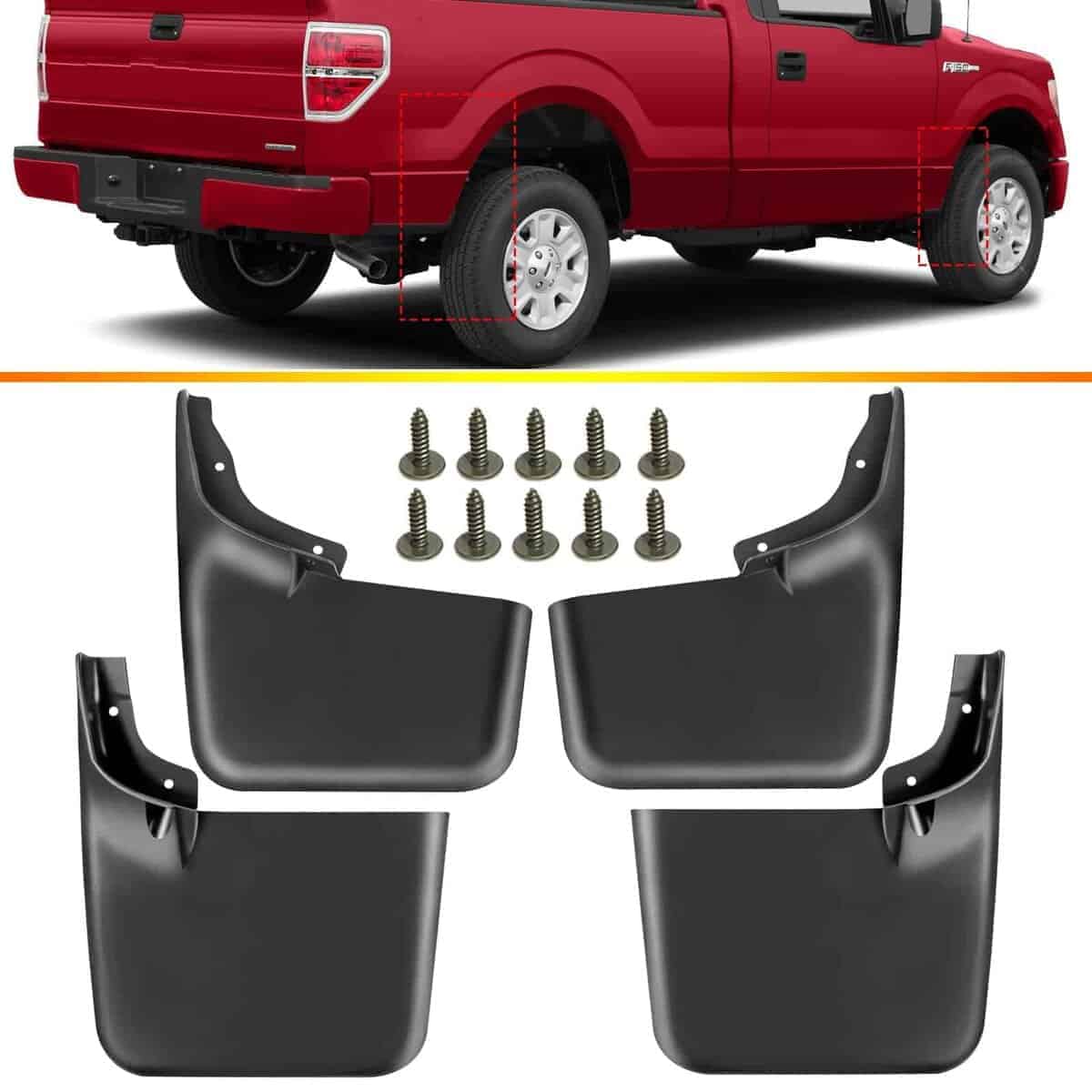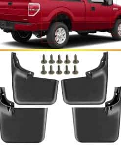 Conjunto de 4 guardabarros salpicaderas de YHTAUTO como accesorios de repuesto para Ford F-150 2004-2014, delanteros y traseros, LH y RH, en color negro. Estos guardabarros de rueda de alta calidad son la solución perfecta para proteger tu vehículo de suciedad, escombros y otros elementos que pueden dañar la pintura y las ruedas. Diseñados para adaptarse perfectamente a un modelo de coche determinado, son compatibles con todos los f150 del 2004-2014 con molduras de borde de rueda de fábrica. No se ajustarán al f150 raptor o a cualquier f150 con estribos de fábrica estilo «plataforma» similares, tampoco a los estribos desplegables eléctricos ni a la variante flareside/stepside. Sin embargo, funcionarán con todos los estribos y barras de accesorios de fábrica de Ford. El conjunto incluye 4 guardabarros detrás de la rueda delantera y trasera, con los accesorios necesarios. Su diseño contorneado complementa las líneas del vehículo y su construcción de plástico negro resistente a la rotura. El guardabarros de salpicaduras de YHTAUTO es la elección inteligente de accesorios exteriores de automóviles para proteger la pintura de tu coche a un costo asequible. Su instalación fácil supera las reparaciones de coche en términos de seguridad e inversión.
