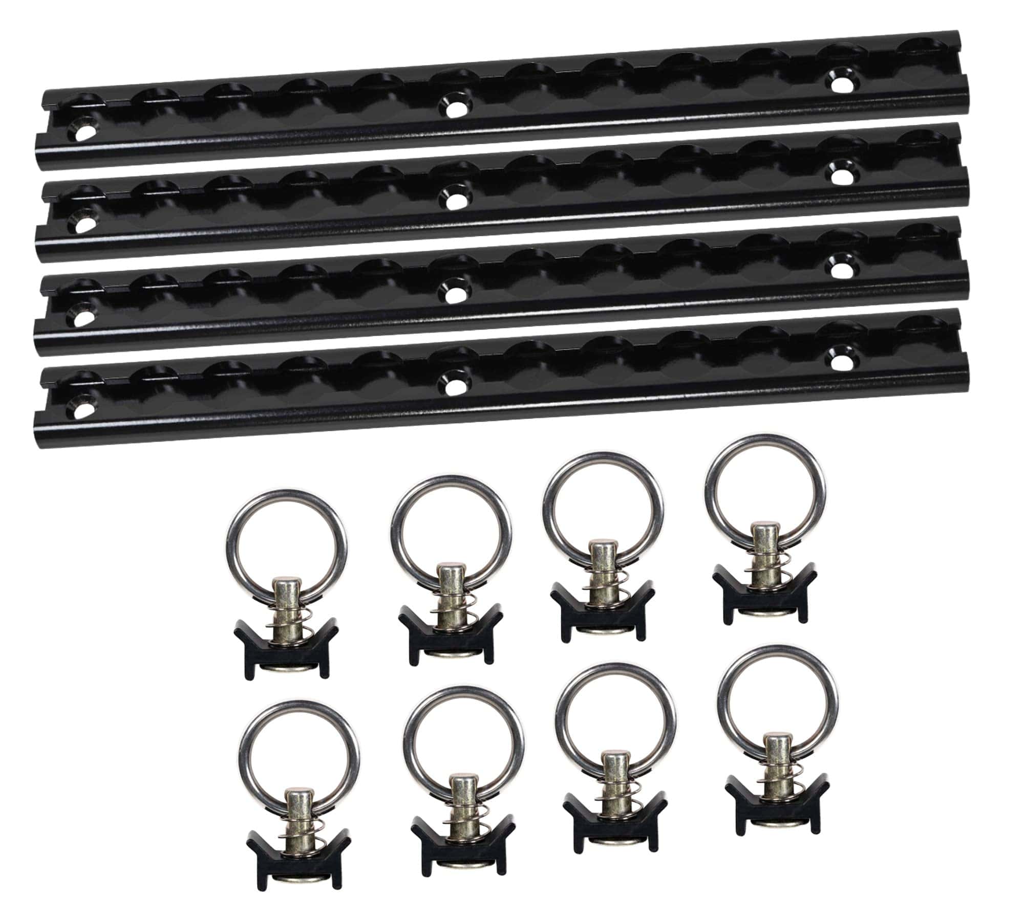Conjunto de 4 piezas de rieles L-Track de 1 pie en polvo negro recubierto con bajo perfil fuerte Material: aluminio resistente recubierto en polvo negro Longitud: 48» (con 9 agujeros de montaje) Diámetro del agujero es 0.25» (se adapta a las conexiones estándar de L-Track) Fácil de instalar en camas de camiones y remolques Conjunto de 8 piezas de perno de fijación L-Track con recubrimiento en polvo negro Color: Negro recubierto en polvo Límite de carga de trabajo: 1333 lbs Resistencia a la rotura: 4000 lbs El perno de fijación de un solo perno está diseñado para ser utilizado con rieles L-Track Este es uno de los pernos más fuertes disponibles para asegurar en rieles L track Con los múltiples usos de la pista L, este perno se puede enganchar rápidamente en la pista para proporcionarle el punto de anclaje que necesita para conectar sus correas de amarre.