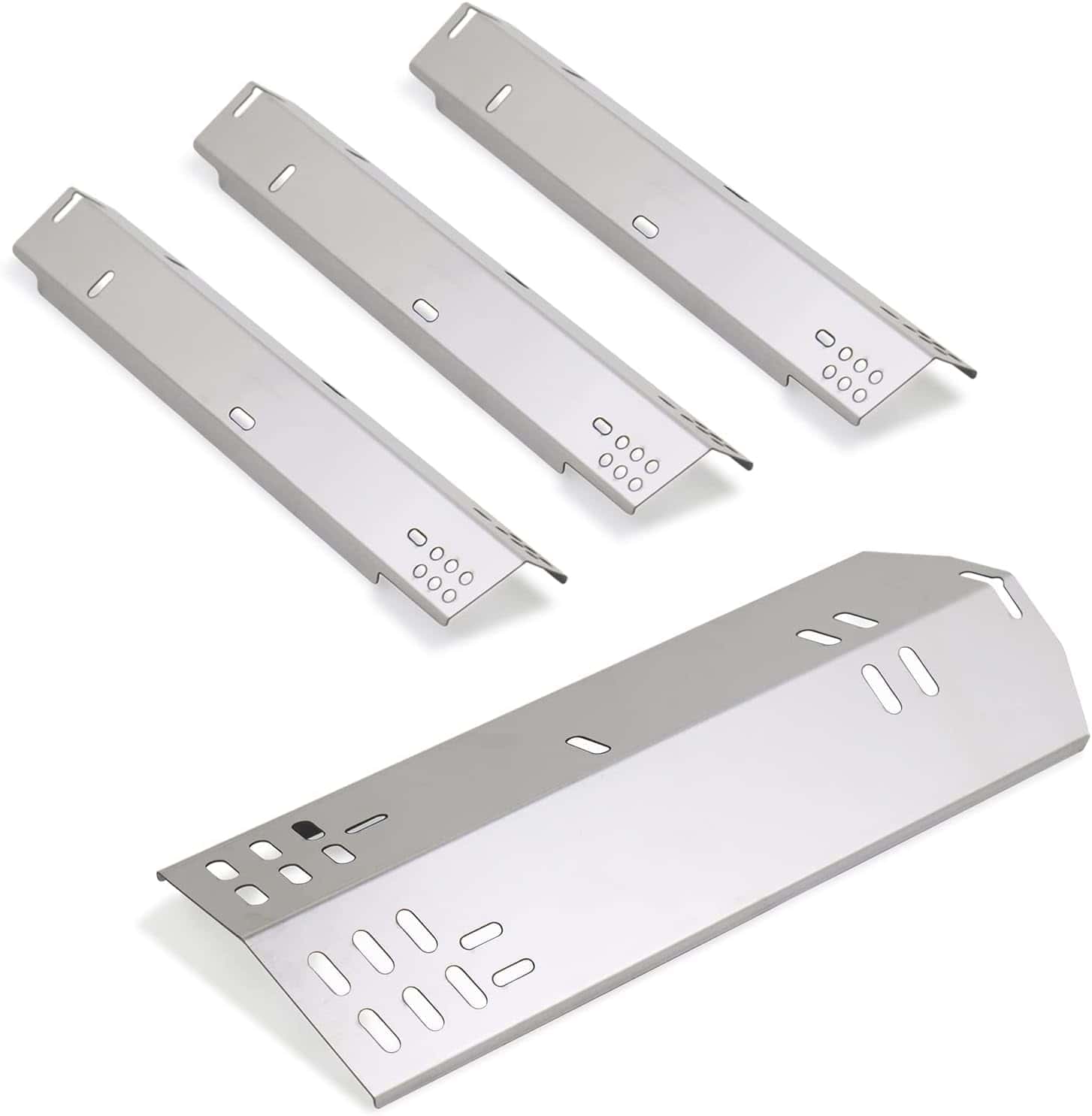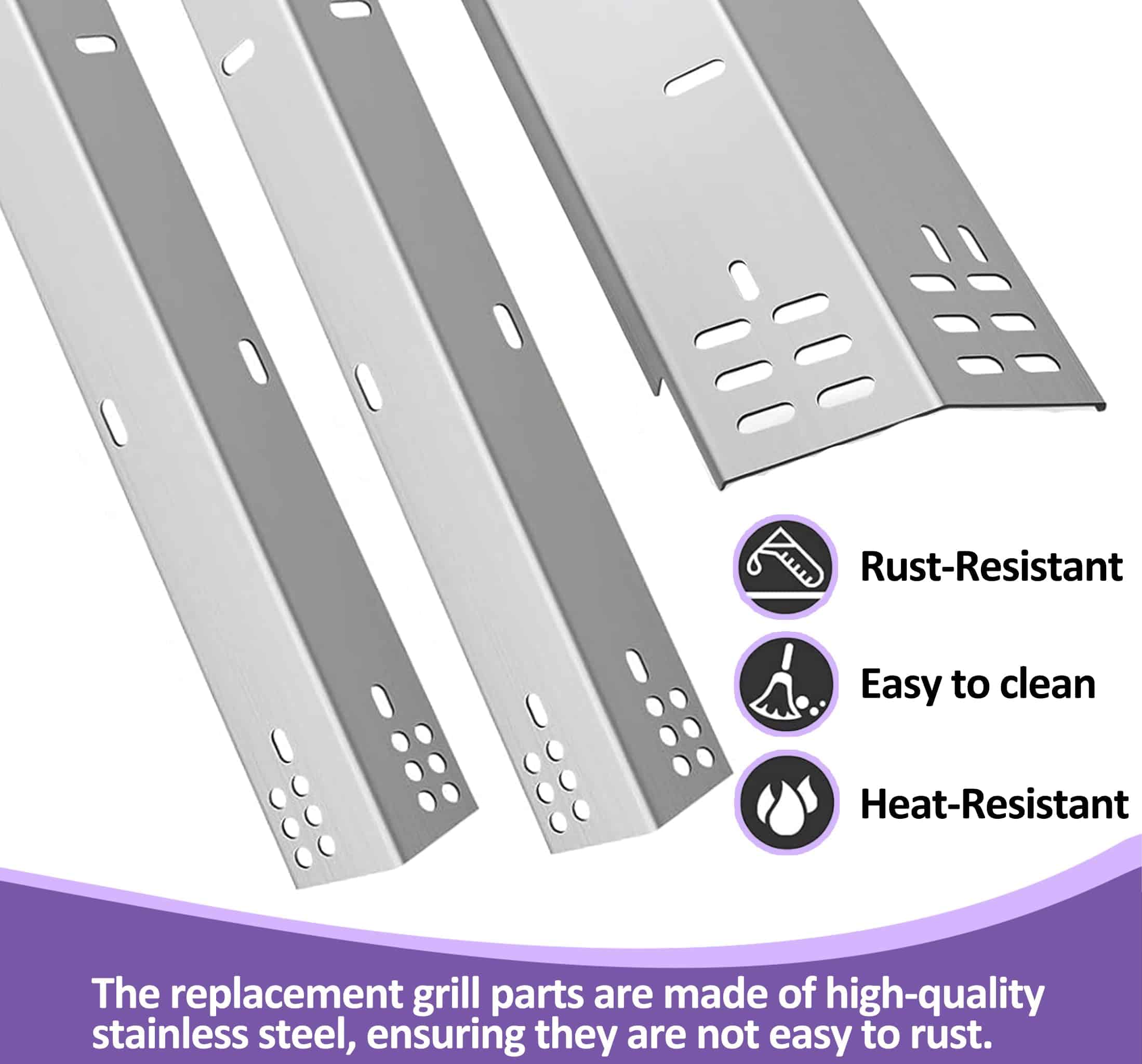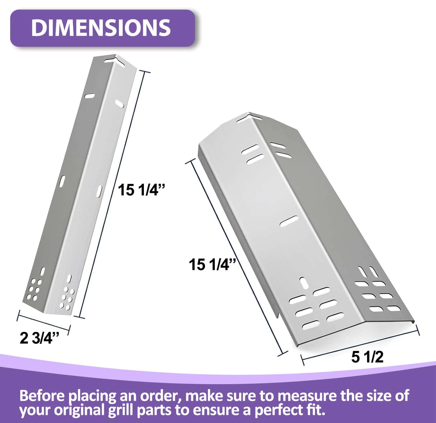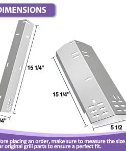 En cuanto a dimensiones, las láminas térmicas principales miden 15.25 pulgadas de largo y 2.75 pulgadas de ancho, mientras que el protector térmico del quemador superior mide 15 1/4 pulgadas de largo y 5 1/2 pulgadas de ancho. Estas dimensiones garantizan un ajuste preciso para los modelos de parrilla especificados, contribuyendo al rendimiento óptimo de la parrilla.
