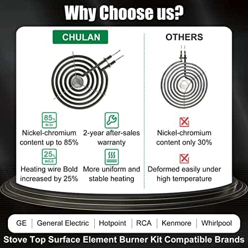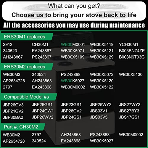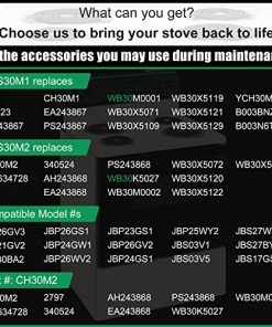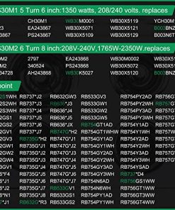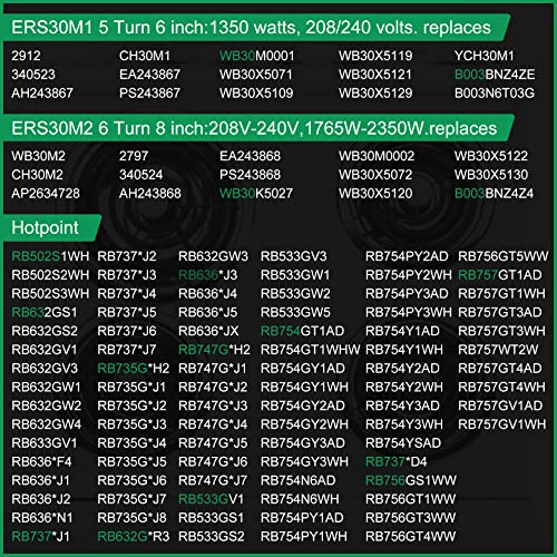 Este conjunto de reemplazo de quemador eléctrico se ajusta a la mayoría de las estufas eléctricas General Electric, incluyendo modelos GE, Hotpoint, Whirlpool, Sears y Kenmore. Reemplace los números de pieza: AH243867, AH243868, AP2634728, B003BNZ4ZE, B003N6T03G, EA243867, EA243868, EAP243868, PS243867, PS243868, WB30K5027, WB30M0001, WB30M0002, WB30X5071, WB30X5072, WB30X5109, WB30X5119, WB30X5120, WB30X5121, WB30X5122, WB30X5129, WB30X5130, YCH30M1.2797, 2912, 340523, 340524. Este conjunto incluye 2 piezas de WB30M1 (6 pulgadas, 1350 vatios, 208/240 voltios, 4 vueltas) y 2 piezas de WB30M2 (8 pulgadas, 1765 vatios, 240V/208V, 6 vueltas). Nuestra parte de reemplazo está hecha de material duradero de alta calidad y ha sido probada por el fabricante para una instalación fácil y económica. Verifique las dimensiones mostradas en la descripción para asegurarse de que se ajusten a su estufa antes de comprar. Ofrecemos una garantía del 100% de satisfacción. Si tiene algún problema después de recibir este artículo, no dude en contactarnos, resolveremos todos los problemas en 24 horas.