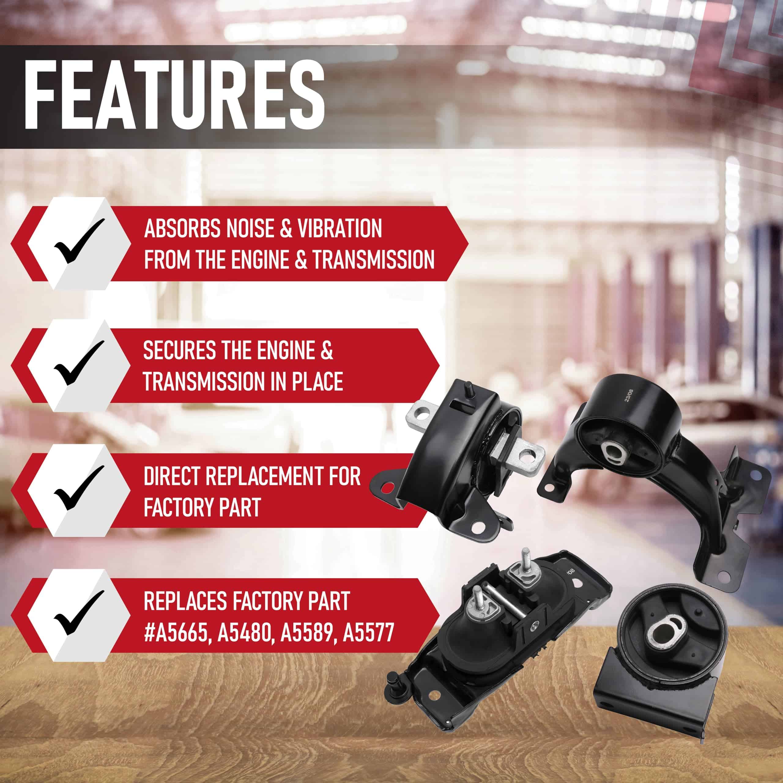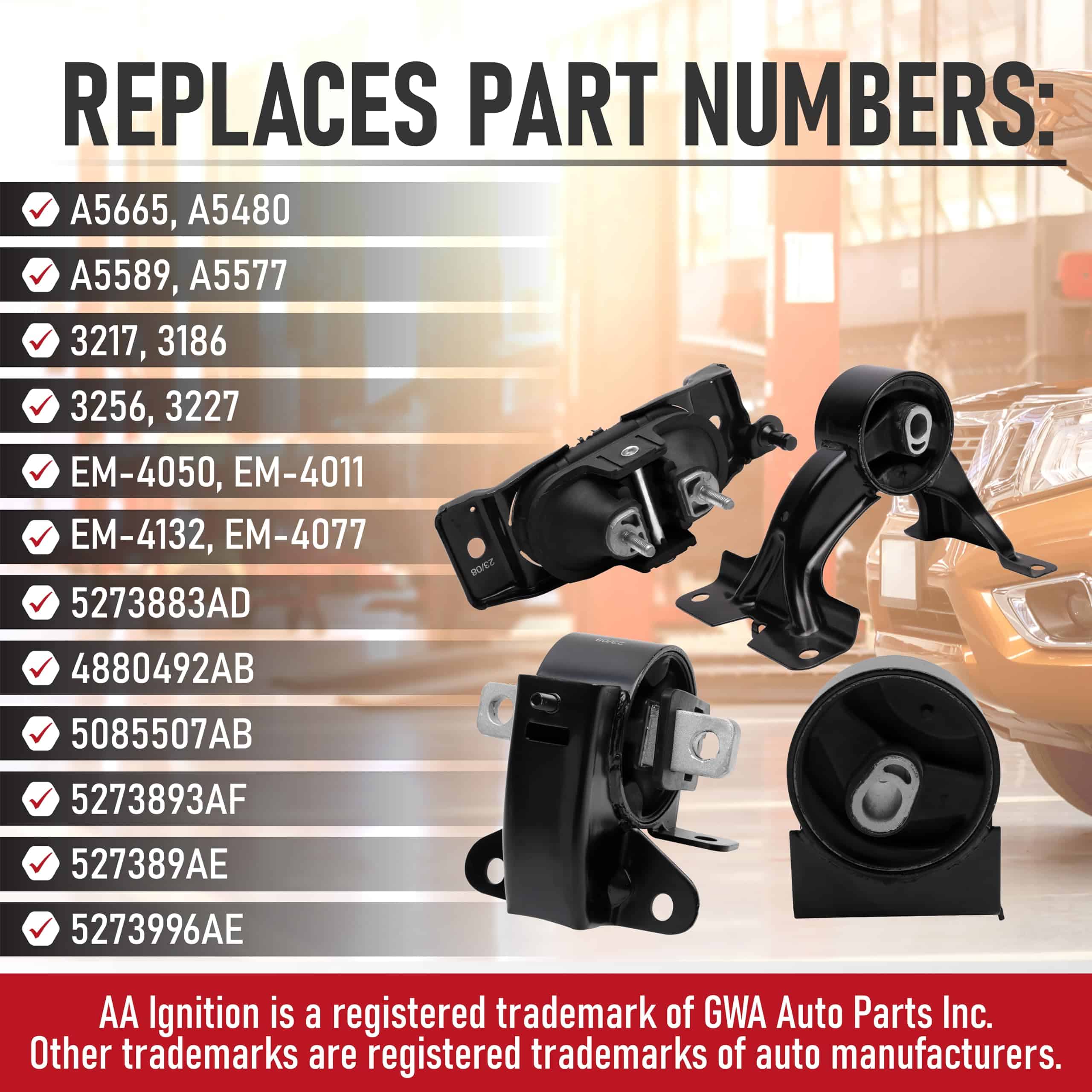Este conjunto de soportes de motor y transmisión reemplaza las partes A5665, A5480, A5589, A5577, 3217, 3186, 3256, 3227, EM-4050, EM-4011, EM-4132, EM-4077, 5273883AD, 4880492AB, 5085507AB, 5273893AF, 527389AE, 5273996AE comúnmente encontrados en vehículos con motor de 3.6 litros. Al ser reemplazos directos, estos soportes se ajustarán y funcionarán como las piezas de fábrica, manteniendo la calidad y el acabado originales.