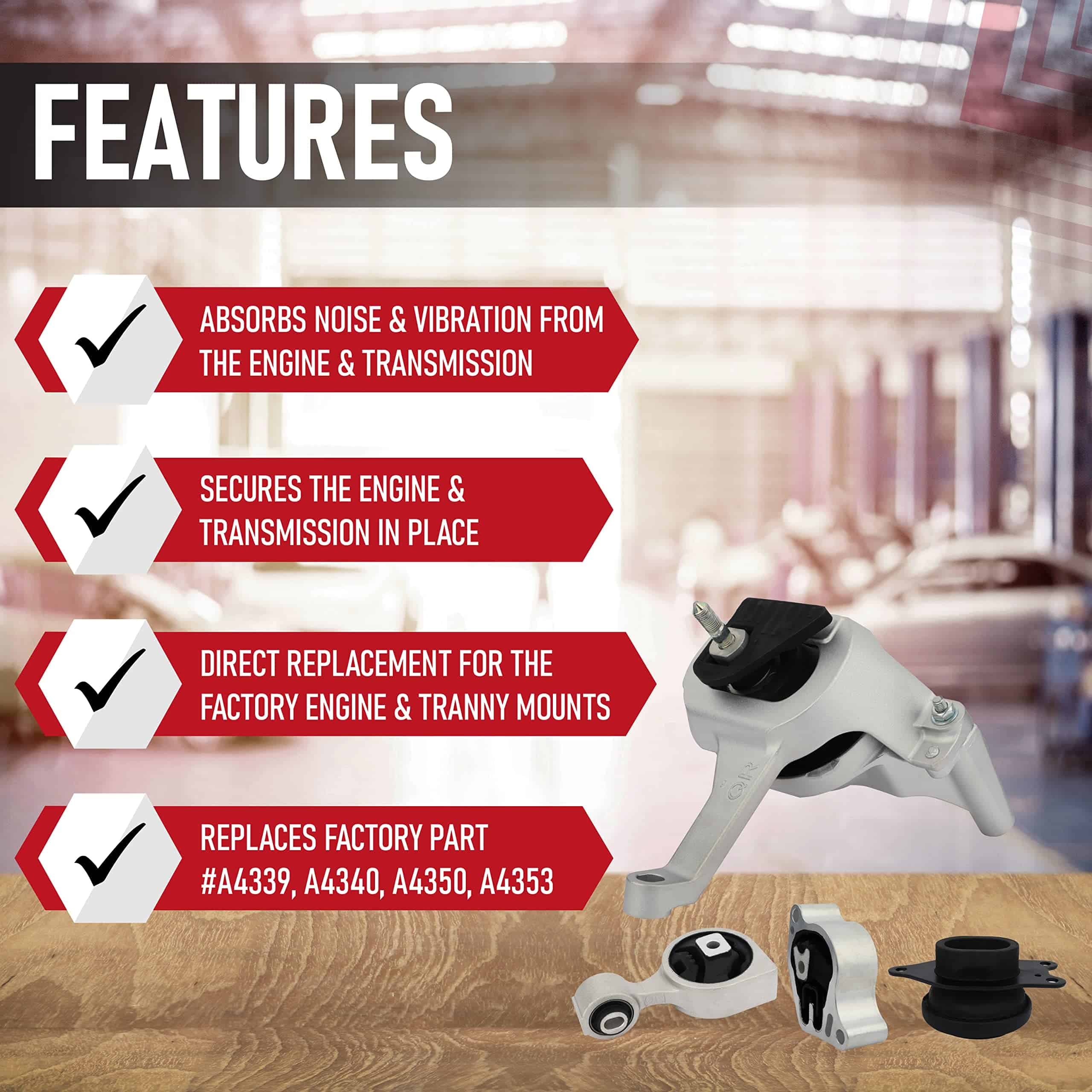 Los soportes de motor absorben ruido y vibraciones del motor mientras lo aseguran en su lugar. Si escucha golpes y siente que el motor rebota durante paradas o aceleraciones repentinas, esto puede ser el culpable. Este conjunto de soportes encaja en todos los lados del motor y la transmisión y se puede encontrar debajo del cuerpo delantero del motor. Se recomienda reemplazar todos los soportes a la vez para mantener el equilibrio en la distribución del peso del motor. Compatible con Nissan Altima 2007-2012 2.5L. Reemplaza los números de parte: A4339, A4340, A4350, A4353, 11360-JA000, 11220-JA000, 11350-JA00A, 11210-JA000. Este conjunto de soportes de motor y transmisión es una pieza de reemplazo compatible fabricada por AA Ignition. Este conjunto de soportes de motor y transmisión NO es una pieza OEM genuina.
