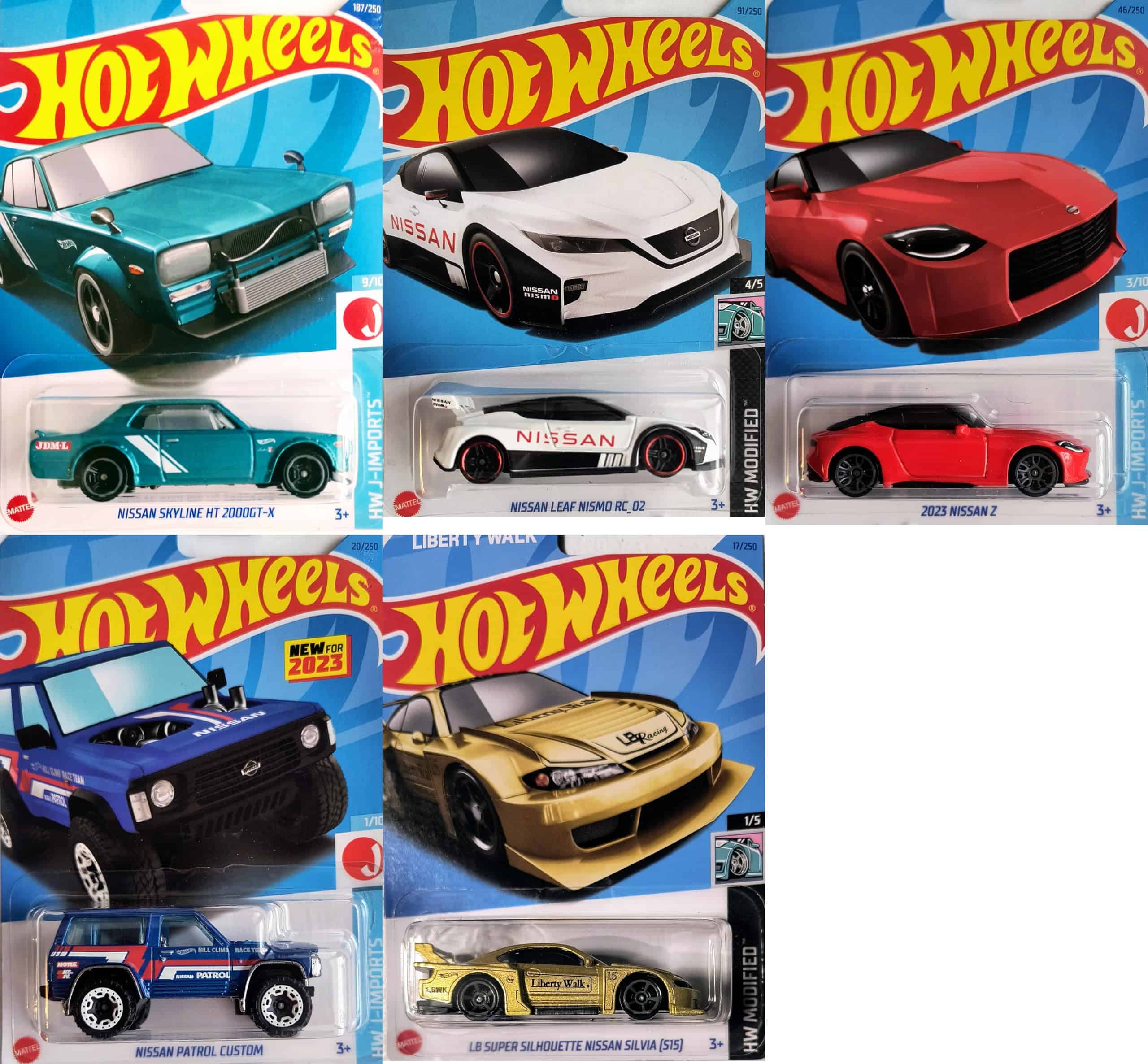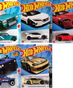 Incluye 5 vehículos Nissan de fundición a escala 1:64. El conjunto incluye Hot Wheels LB Silhouette Nissan Silvia S15 Matte Gold 17/250 2023 Nissan Z Red 46/250 Nissan Patrol Custom Blue 20/250, Hot Wheels Nissan Leaf Nismo RC 02 White y Nissan Skyline HT 2000GT-X Spectraflame Seafoam Green 187/250. Estos vehículos son a escala 1:64.