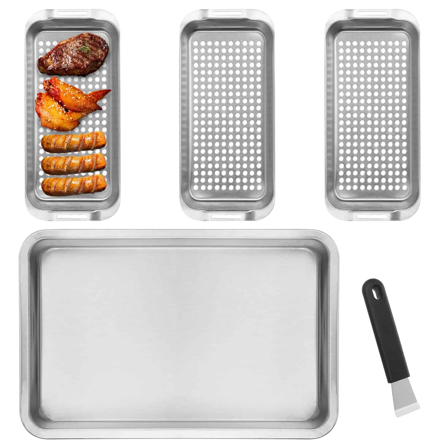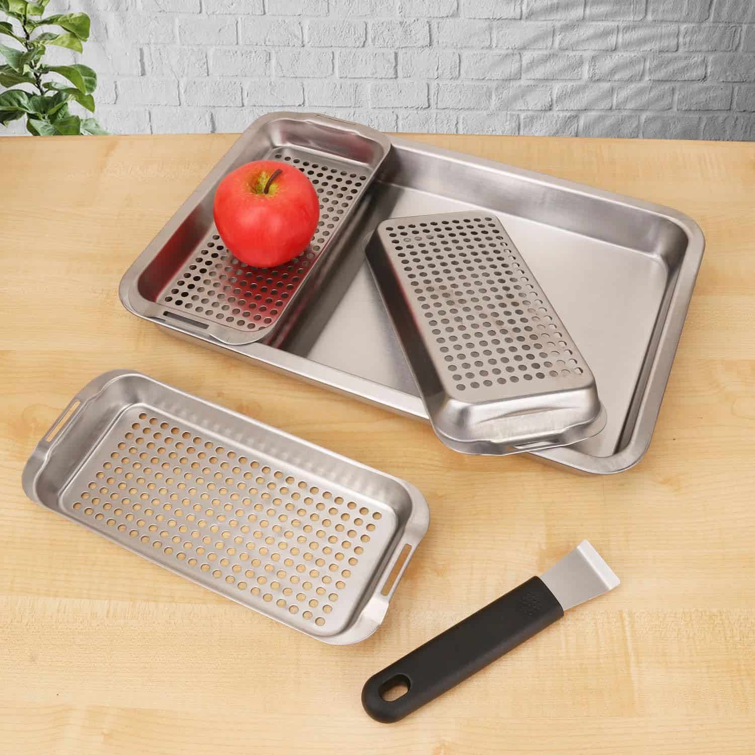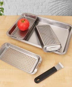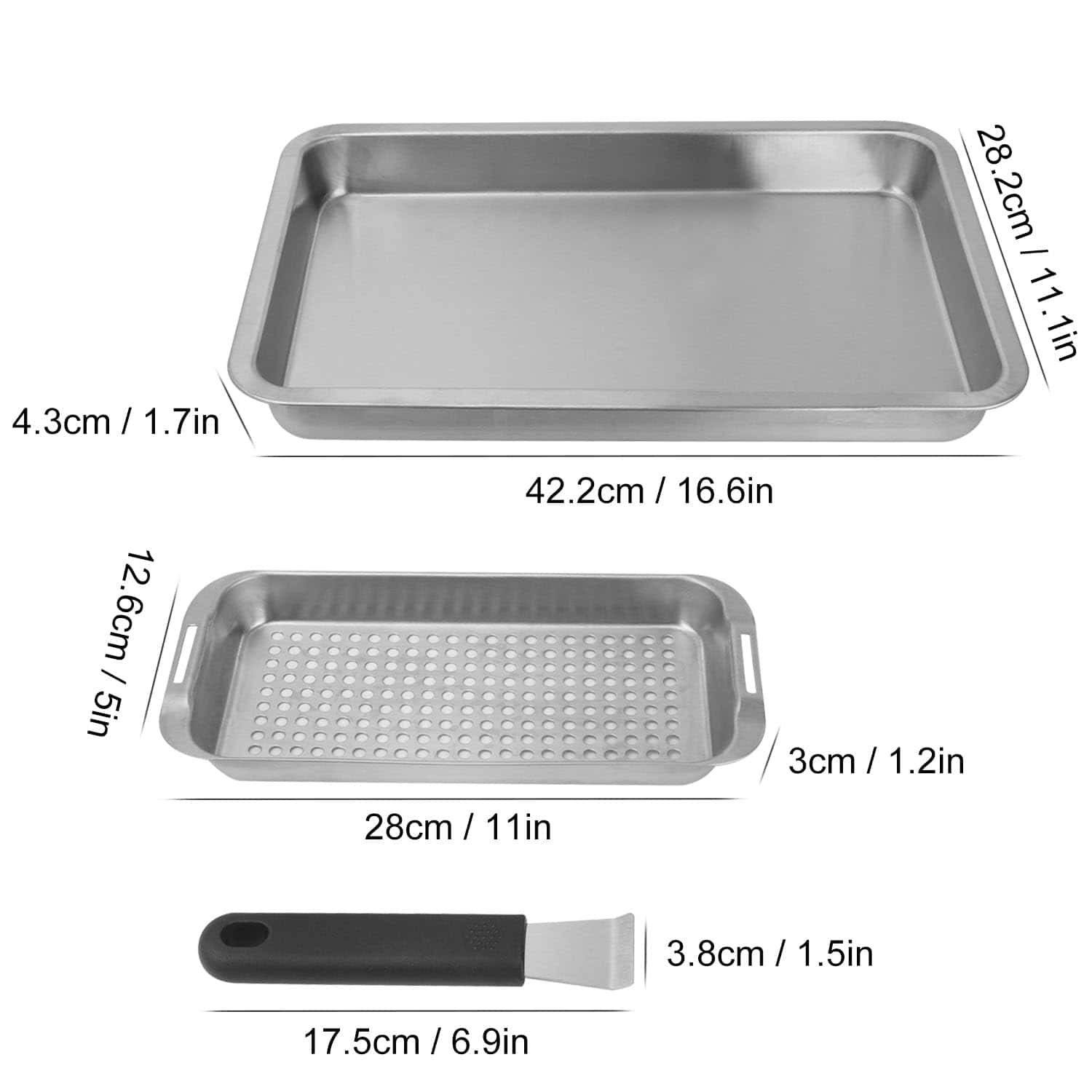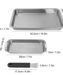 Conjunto completo de 5 piezas Las grandes sartenes de parrilla de acero inoxidable incluyen una bandeja grande para hornear (16.6×11.1×1.7 pulgadas), tres rejillas para enfriar (10.9 x 5 x 1.1 pulgadas cada una) y una pala (7×1.5 pulgadas). Este conjunto completo proporciona todas las herramientas que necesita para una cocción y horneado eficientes. Perfecto para una variedad de necesidades culinarias, incluido el horneado de galletas, pasteles y tortas, así como el asado de verduras y carnes. La bandeja grande y las bandejas de drenaje garantizan resultados crujientes, mientras que la pala es perfecta para voltear y servir alimentos. La alta capacidad y resistencia al calor de la gran sartén para parrilla exterior ofrecen un amplio espacio para hornear varios elementos a la vez, mientras que la construcción de alta resistencia asegura que pueda soportar altas temperaturas. Esto lo hace ideal para uso doméstico y profesional, brindando estabilidad y durabilidad incluso bajo calor intenso. La superficie lisa de estos accesorios de parrilla los hace fáciles de limpiar, asegurando que se mantengan en excelentes condiciones para un uso repetido. Esta característica es particularmente útil para cocinas ocupadas donde la higiene y la eficiencia son primordiales.