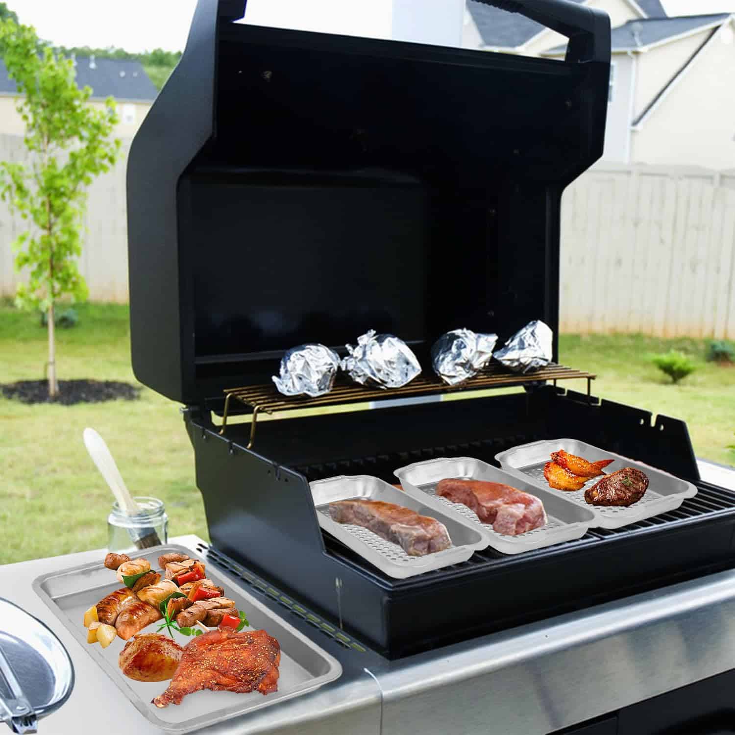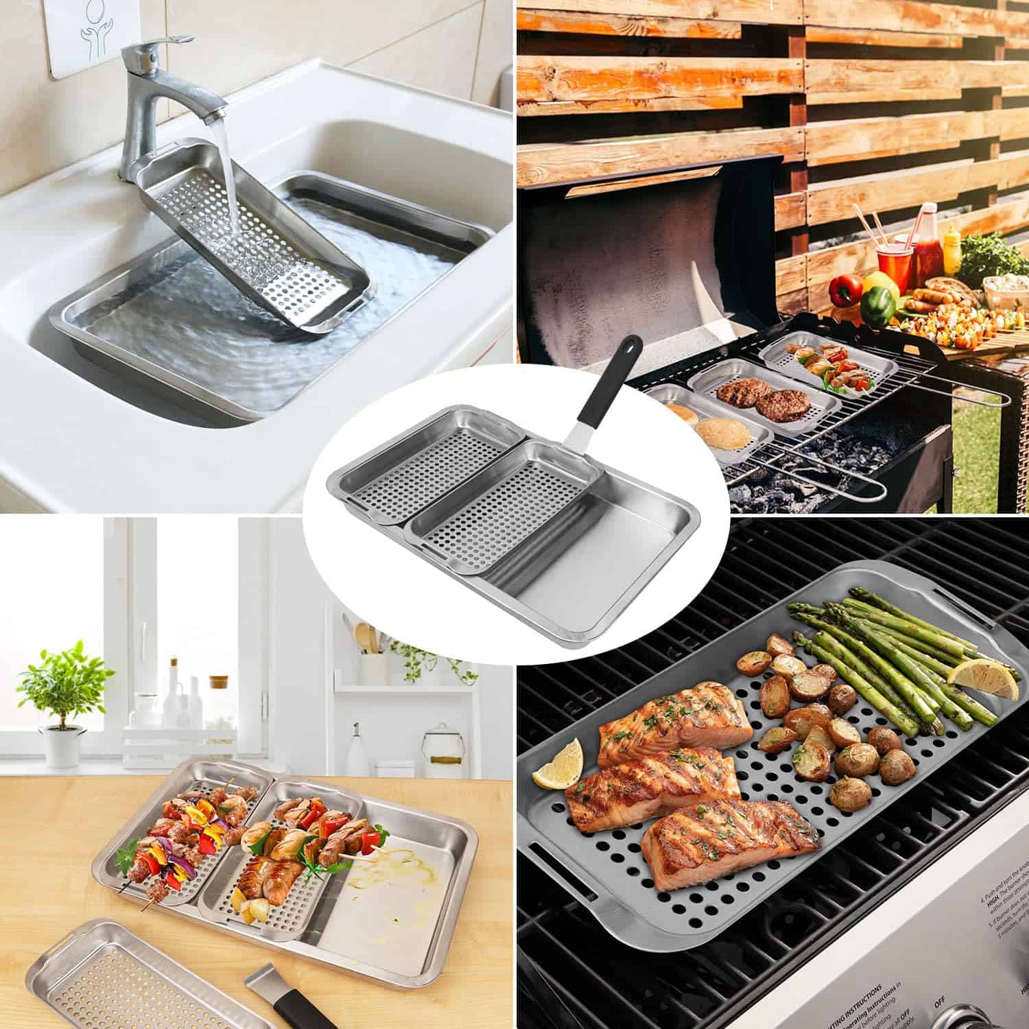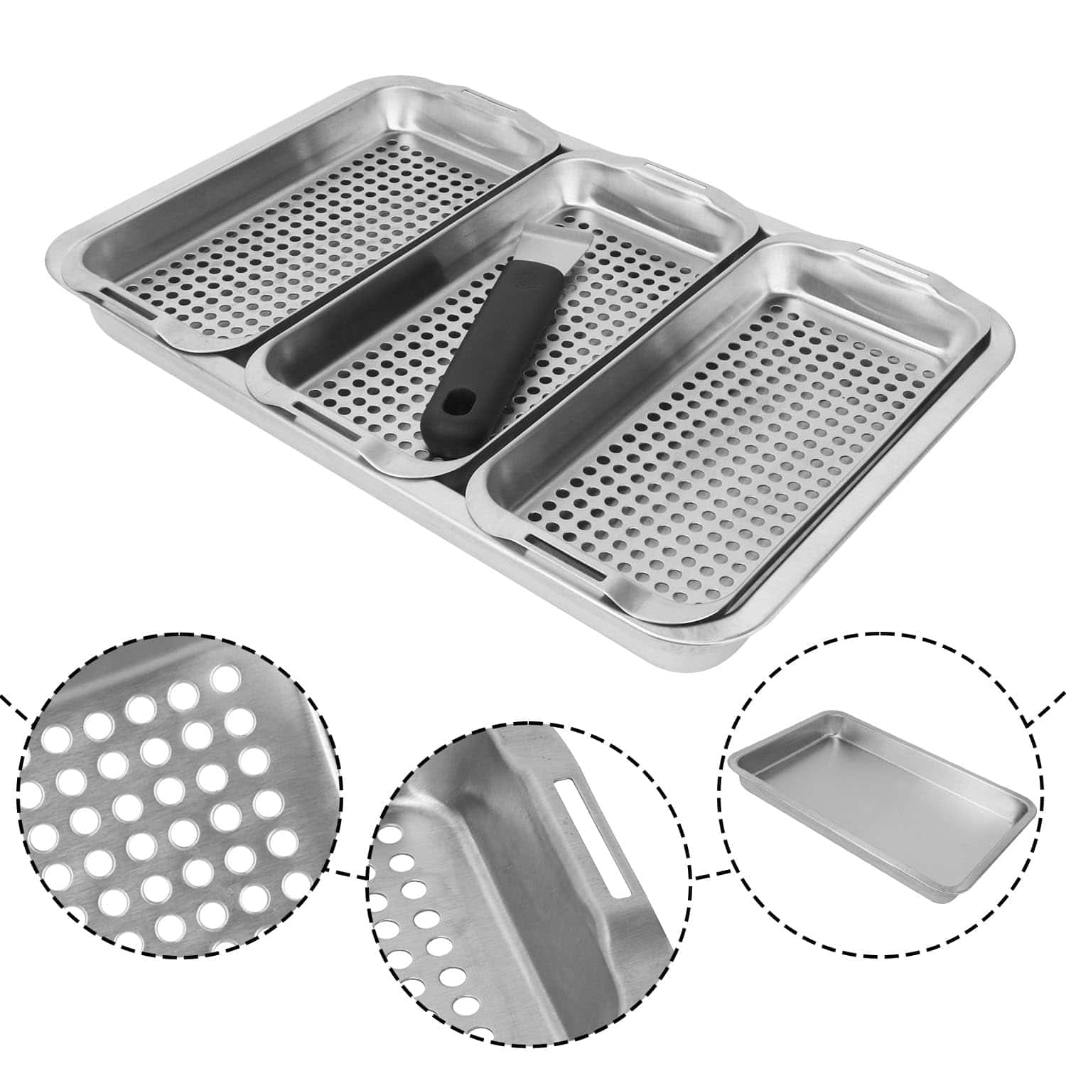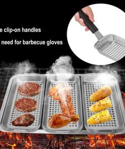 Conjunto completo de 5 piezas Las grandes sartenes de parrilla de acero inoxidable incluyen una bandeja grande para hornear (16.6×11.1×1.7 pulgadas), tres rejillas para enfriar (10.9 x 5 x 1.1 pulgadas cada una) y una pala (7×1.5 pulgadas). Este conjunto completo proporciona todas las herramientas que necesita para una cocción y horneado eficientes. Perfecto para una variedad de necesidades culinarias, incluido el horneado de galletas, pasteles y tortas, así como el asado de verduras y carnes. La bandeja grande y las bandejas de drenaje garantizan resultados crujientes, mientras que la pala es perfecta para voltear y servir alimentos. La alta capacidad y resistencia al calor de la gran sartén para parrilla exterior ofrecen un amplio espacio para hornear varios elementos a la vez, mientras que la construcción de alta resistencia asegura que pueda soportar altas temperaturas. Esto lo hace ideal para uso doméstico y profesional, brindando estabilidad y durabilidad incluso bajo calor intenso. La superficie lisa de estos accesorios de parrilla los hace fáciles de limpiar, asegurando que se mantengan en excelentes condiciones para un uso repetido. Esta característica es particularmente útil para cocinas ocupadas donde la higiene y la eficiencia son primordiales.
