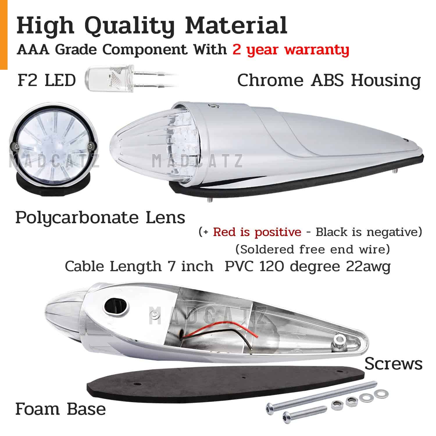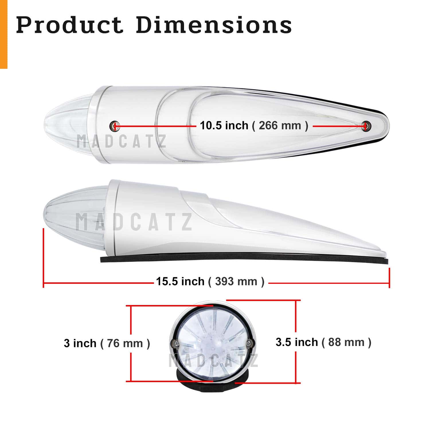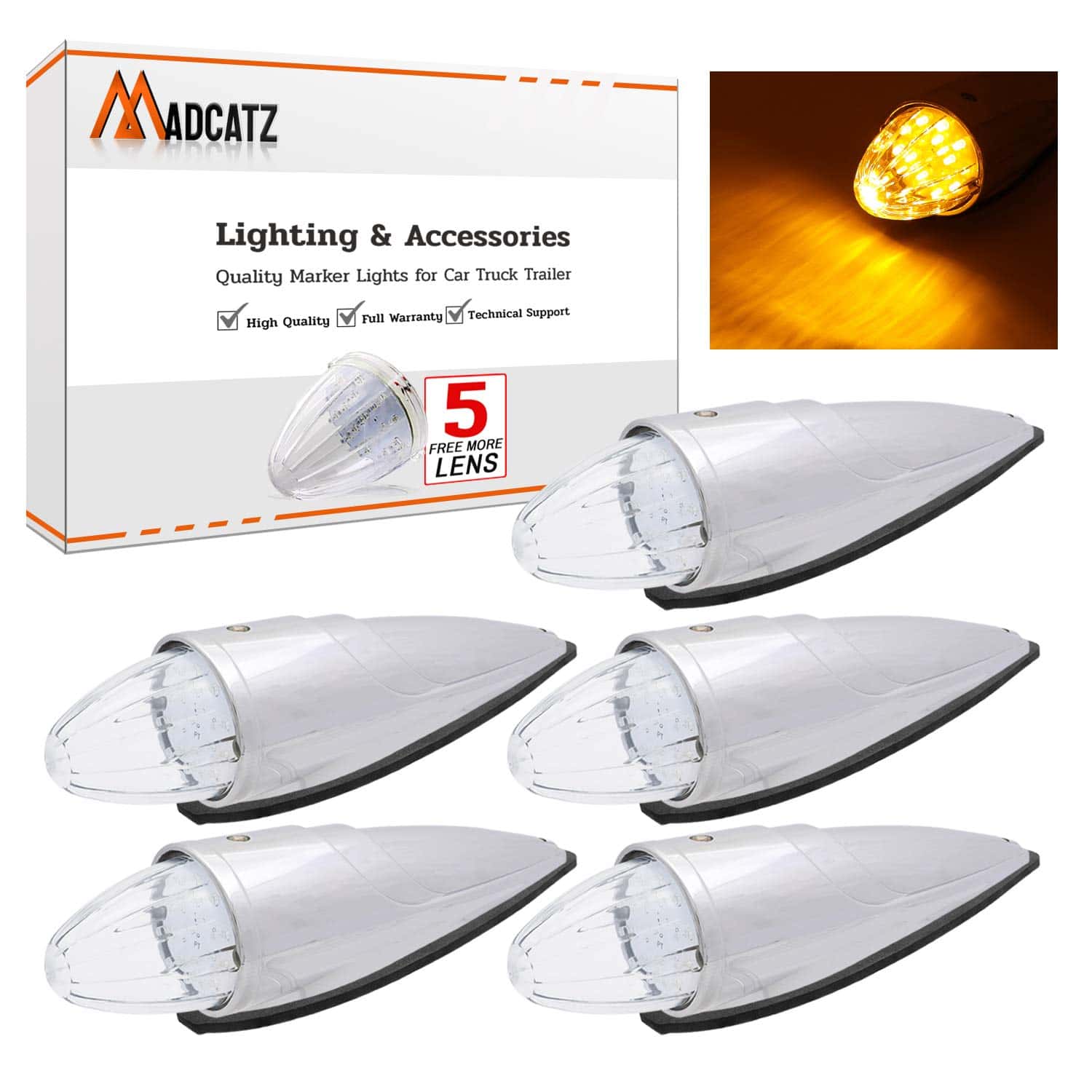 MADCATZ garantiza verdaderamente una garantía de 12 meses para cualquier defecto de fabricación desde la fecha de compra; la garantía permite devolver o reemplazar las luces en caso de defectos del fabricante. El paquete incluye 5 luces de marcador de cabina de color ámbar con lente clara y base cromada con tornillos y almohadillas suaves, además de 5 cubiertas de lente clara adicionales de luz ámbar. Estas luces son ideales para camiones, remolques, tractores, autobuses, botes y otros vehículos únicos. Son resistentes a impactos y menos propensas a dañarse por golpes. Cada LED está conectado directamente y protegido contra los elementos. Consumen menos energía, producen menos calor y son más brillantes y rápidos que las bombillas incandescentes. La tensión de entrada es de 12 voltios. Las medidas totales son de aproximadamente 15.5 x 3.5 x 3.5 pulgadas (L x W x H), y el diámetro entre los agujeros de montaje es de 10.5 pulgadas. Por favor, verifique el tamaño de la luz de marcador de cabina para determinar si encaja antes de hacer el pedido. Dos cables están conectados: el rojo es positivo y el negro es negativo.