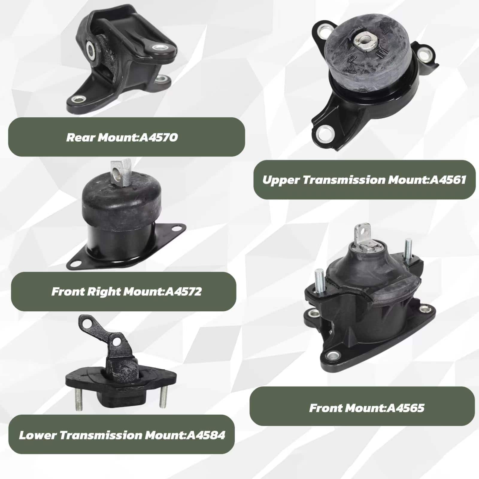 Paquete incluido: 1 soporte de motor delantero, 1 soporte de motor delantero derecho, 1 soporte de motor trasero, 1 soporte de transmisión inferior, 1 soporte de transmisión superior.