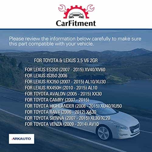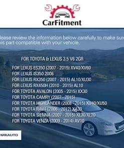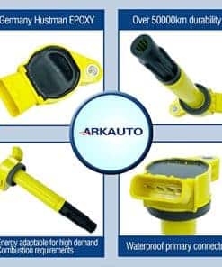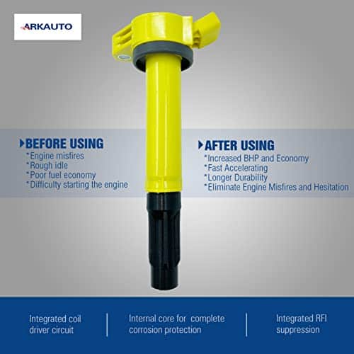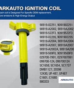 Las bobinas de encendido ARKAUTO están diseñadas de acuerdo a los tipos originales de OE, lo que las hace capaces de reemplazar perfectamente sus bobinas originales defectuosas y funcionar como las originales. Esta bobina es un reemplazo para OE: 90919-02251, 9091902251, 90919-02255, 9091902255, 90919-A2004, 90919A2004, 90919-A2007, 90919A2007, 099700-124, 099700124, UF-487, UF487, C1601, C1680. Los compradores deben comparar con cuidado las OE con las de sus autos originales antes de ordenar para evitar comprar una pieza incorrecta y causar una pérdida innecesaria. Compatible con LEXUS ES350 IS350 RX350 RX450H TOYOTA AVALON CAMRY HIGHLANDER RAV4 SIENNA VENZA 3.5 V6 2GR. Reduce problemas comunes de bobinas de encendido como: arranque difícil o nulo, tiempo de arranque prolongado, fallos, falta de potencia, cambios inconsistentes en la transmisión, bujías sucias, falla prematura del convertidor catalítico, mala economía de combustible, iluminación de la luz del motor de comprobación. Garantía limitada de 1 año – Por favor verifique si esta pieza es compatible con su vehículo.