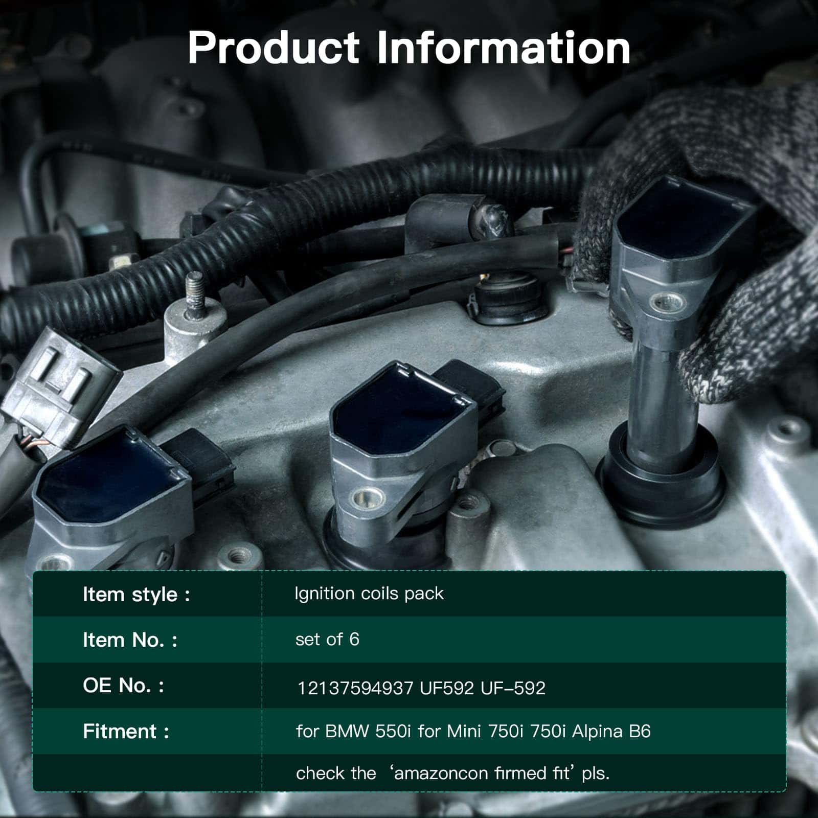 Este conjunto de 6 bobinas de encendido de SCITOO es compatible con una amplia gama de vehículos, incluidos BMW X6 4.4L (2008-2016), Mini Cooper 1.6L (2009-2013) y BMW 550i 4.4L (2011-2016), entre otros. Las bobinas de encendido son un componente crucial del sistema de encendido del motor y, si están defectuosas, pueden provocar fallas en el motor, ralentí irregular y pérdida de potencia. Es importante reemplazar las bobinas defectuosas con este conjunto de bobinas de alta calidad para mejorar el rendimiento de su automóvil. SCITOO ofrece un período de garantía de 1 año para todos los clientes, así que si experimenta problemas de calidad o logística, no dude en contactarnos.
