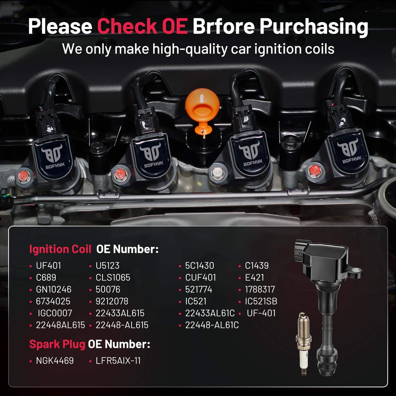 BDFHYK es un fabricante de piezas de automóviles con una sólida reputación en el mercado, con más de 10 años de experiencia en la industria. Nuestros productos son respaldados por una garantía de 12 meses y un servicio de atención al cliente de por vida, lo que garantiza la satisfacción y la confianza de nuestros clientes. Si necesitas ayuda adicional o tienes preguntas sobre nuestros productos, no dudes en ponerte en contacto con nuestro equipo de atención al cliente. Elige BDFHYK para una solución confiable y de calidad para tus necesidades de bobinas de encendido y bujías.