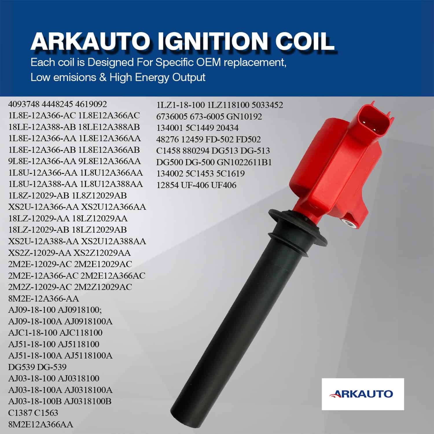 2. Ventaja – Las bobinas de encendido ARKAUTO están diseñadas de acuerdo con los tipos OE originales, las cuales pueden reemplazar perfectamente tus bobinas defectuosas originales y funcionar como las originales. Esta bobina es un reemplazo para OE: 4093748 4448245, 4619092, 1L8E-12A366-AC, 1L8E12A366AC, 18LE12A388AB, XS2Z-12029-AA, 12459, FD-502, FD502, DG513, DG500, DG-500, GN1022611B1, 12854, UF-406, UF406, los compradores deben comparar el OE con los de sus autos originales cuidadosamente antes de hacer el pedido para evitar comprar una parte incorrecta y causar una pérdida innecesaria.
