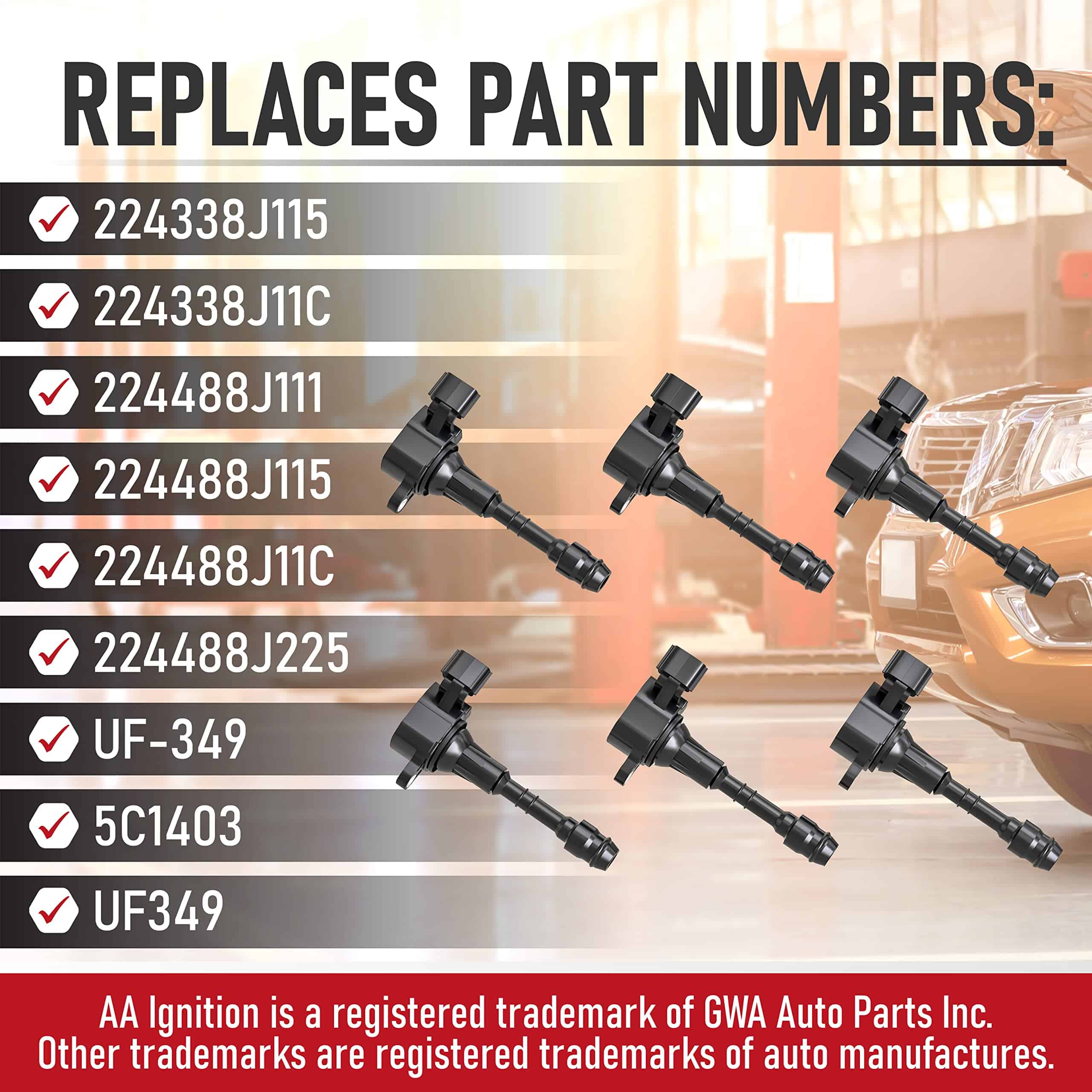 1. Conjunto de 6 Bobinas de Encendido de Reemplazo – Las bobinas de encendido proporcionan chispa para su motor. Con el tiempo, las bobinas de encendido de fábrica pueden fallar, lo que conduce a un bajo rendimiento de gasolina, hesitación y una luz de motor de check engine (CEL). Reemplace su bobina de encendido defectuosa y restaure el rendimiento y la capacidad de conducción en su Altima, Maxima, Murano, Xterra o Pathfinder. 2. Reemplazo Compatible para Vehículos Nissan e Infiniti V6 – 2002 – 2006 Altima | 2002 – 2008, 2016 – 2017 Maxima | 2003 – 2008, 2015-2016 Murano | 2004 – 2009 Quest | 2002 – 2004 I35 | 202 – 2003 QX4 | 2005 – 2016 Frontier 4.0L | 2005 – 2014 Xterra 4.0L | y más. Vea a continuación la lista completa. Las bobinas de encendido se pueden encontrar fácilmente dentro del compartimiento del motor generalmente enchufadas encima del motor una vez que se quita la cubierta del motor. 3. Reemplaza las Partes 224338J115, 224338J11C, 224488J111, 224488J115, 224488J11C, 224488J225, UF-349, 5C1403, UF349 comúnmente encontradas en los populares modelos Altima, Frontier, Xterra, Equator, NV1500, NV2500, NV3500, Quest y más incluyendo modelos con años 02, 03, 04, 05, 06, 07, 08, 09, 12, 13, 14, 15, 16, 17. 4. Ajuste OEM, Calidad, Acabado – Aunque esto no es una pieza OEM genuina, es un reemplazo directo para su vehículo I35, QX4 3.5L, NV1500 2012, Pathfinder 2010 o Altima 2006 y aparecerá, se ajustará y funcionará como la pieza de fábrica. Ahorre tiempo y cientos de dólares en comparación con los precios de los concesionarios al reemplazar la pieza usted mismo. 5. Garantía de 2 años o 24,000 Millas – Este conjunto de 6 bobinas de encendido viene completo con una garantía de 2 años o 24,000 millas. Si la bobina falla en su Altima, Maxima, Murano, Xterra o Pathfinder dentro del período de garantía, simplemente contáctenos para un reemplazo. Ahorre tiempo y dinero aprovechando esta garantía.
