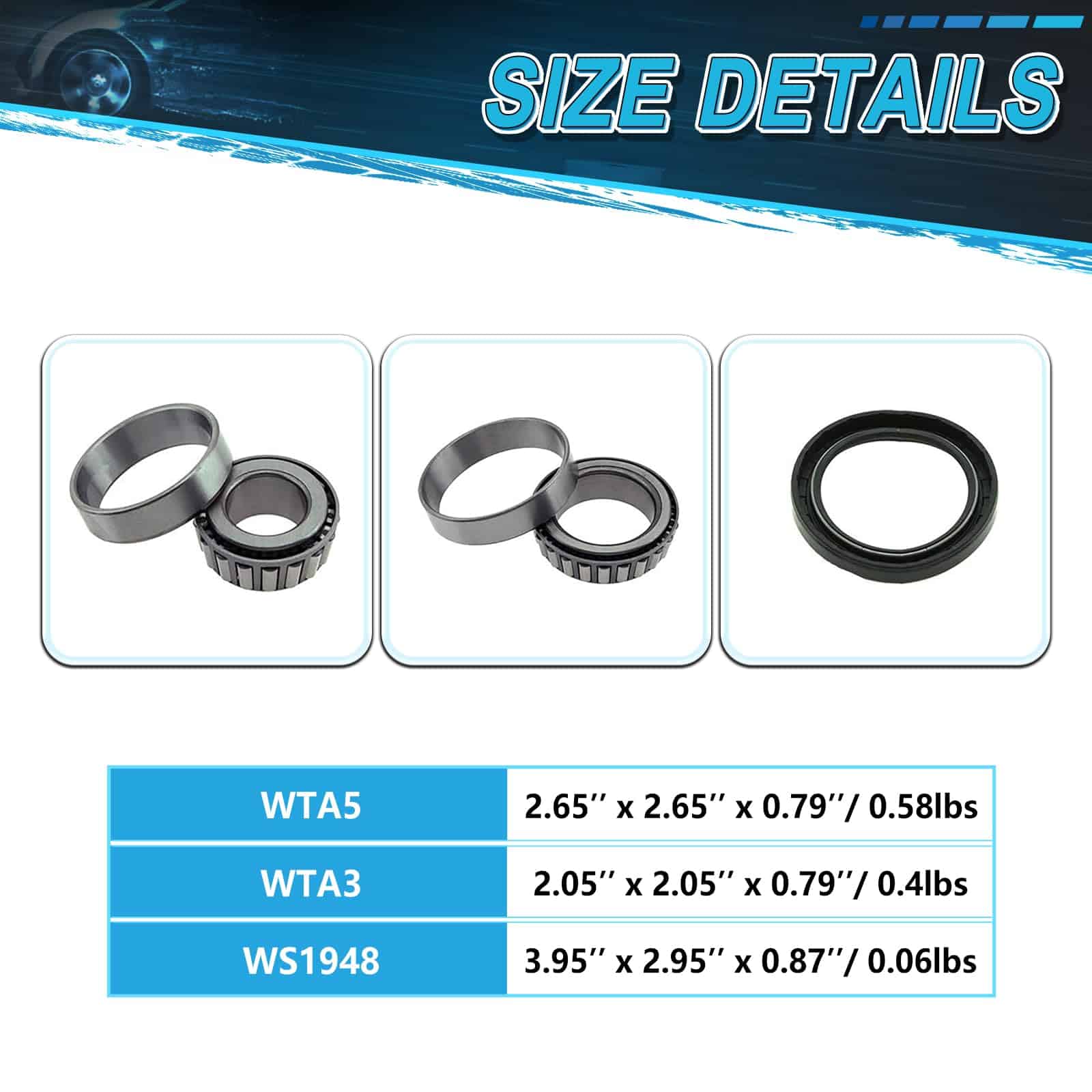 2. Dimensiones: Cojinete de Rueda WTA52.65 2.65 0.79PULG / 0.58LB ; WTA32.05 2.05 0.79PULG / 0.4LB ; Sello de Rueda WS19482.95 2.95 0.87PULG / 0.06LB.