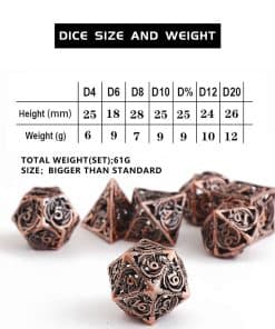 Este conjunto de dados huecos de metal es perfecto para cualquier amante de los juegos de mesa y de rol. El diseño hueco le da un aspecto único y ligero, lo que los hace ideales para transportar y jugar en cualquier lugar. Hechos de cobre fino, estos dados son equilibrados y detalladamente hermosos, lo que los convierte en una adición imprescindible para tu colección de dados. Además, vienen en una caja de regalo que los hace perfectos para regalar a amigos y familiares. ¡No pierdas la oportunidad de tener estos increíbles dados en tu próxima partida de Dungeons and Dragons o cualquier otro juego de rol que desees jugar!