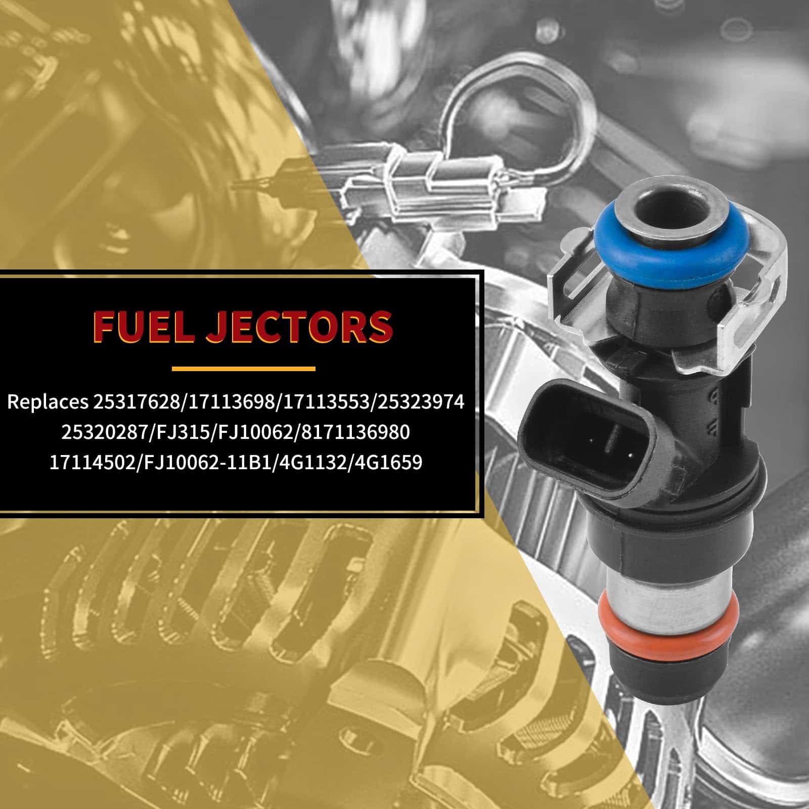 Conjunto de 8 inyectores de combustible compatibles con various modelos de vehículos Chevrolet y GMC. Se incluyen 8 piezas de inyectores de combustible en el paquete. Números de pieza OEM: 17113553, 17113698, FJ315, FJ10062, 25317628, 25323974, 25320287, 8171136980, 1711450. Si tiene alguna pregunta sobre la calidad del producto o su pago, no dude en contactarnos, ya que siempre contamos con un excelente servicio al cliente.
