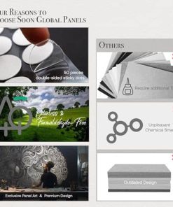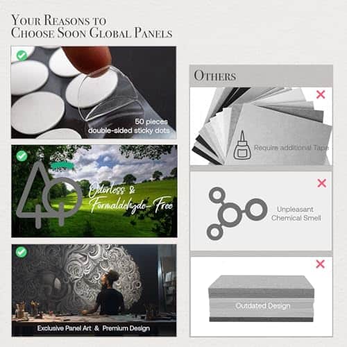 1. Aislamiento Acústico Superior: Construidos con material de fibra de poliéster de alta densidad, nuestros paneles destacan en la absorción de sonido, reduciendo eficazmente el ruido no deseado y mejorando la calidad del sonido. 2. Colaboración Artística: Eleve su experiencia de aislamiento acústico con un toque de arte. Cada panel presenta diseños curados de artistas reconocidos, convirtiéndolos en una fusión de excelencia acústica y expresión artística. Estas colaboraciones exclusivas de diseñadores de edición limitada crean una estética única y exclusiva que mejora tanto la calidad del sonido como el atractivo visual. 3. Fibra de Poliéster Ignífuga: Fabricados con material de fibra de poliéster ignífugo, estos paneles priorizan la seguridad sin comprometer la excelencia acústica. 4. Instalación Sencilla: Cada conjunto de 8 paneles incluye 50 puntos adhesivos transparentes de doble cara, permitiendo un proceso de instalación preciso y sin complicaciones. No se necesitan herramientas, garantizando una experiencia sin problemas para configurar sus paneles acústicos. 5. Aplicación Versátil: Adecuados para diferentes entornos, desde estudios de grabación y salas de cine en casa hasta oficinas y salas de conferencias, mejorando tanto la acústica como la estética visual.