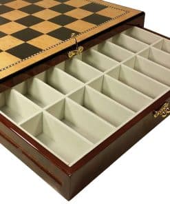 No te pierdas este conjunto de ajedrez con piezas de ajedrez Staunton cromadas y negras en plástico profesional con tablero. Las piezas están doblemente ponderadas y cuentan con bases acolchadas de cuero sintético. El tablero presenta un hermoso laminado de color nogal y maple birdseye de alto brillo sobre madera mdf. La parte inferior del tablero está completamente fieltreada. Tamaño del tablero: 17 1/4″ x 17 1/4″ x 3 1/2″, Superficie de juego: 15″ x 15″ con cuadros de 1 7/8″, Los compartimentos de almacenamiento miden 1 5/8″ x 3 3/4″ en la fila delantera, Los compartimentos de almacenamiento miden 1 5/8″ x 3 5/16″ en la fila trasera, Cada lado tiene su propio cajón. Peso del tablero: 12 libras (sin embalaje). ¡Conjunto de gran apariencia!