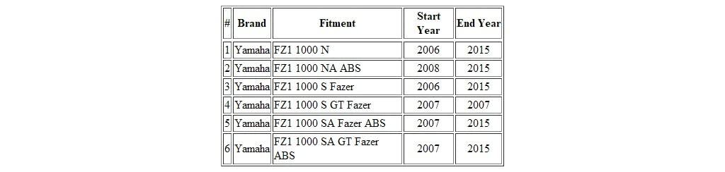 Este cable es compatible con los siguientes modelos Yamaha 1000 FZ1 1000 N (2006-2015) Yamaha 1000 FZ1 1000 NA ABS (2008-2015) Yamaha 1000 FZ1 1000 S Fazer (2006-2015) Yamaha 1000 FZ1 1000 S GT Fazer (2007-2007) Yamaha 1000 FZ1 1000 SA Fazer ABS (2007-2015) Yamaha 1000 FZ1 1000 SA GT Fazer ABS (2007-2015)