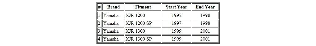 Este cable es compatible con los siguientes modelos Yamaha 1200 XJR 1200 (1995-1998) Yamaha 1200 XJR 1200 SP (1997-1998) Yamaha 1300 XJR 1300 (1999-2001) Yamaha 1300 XJR 1300 SP (1999-2001)