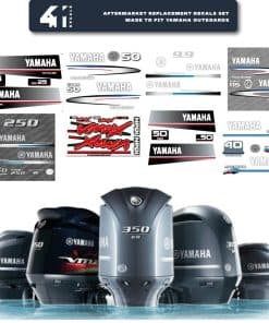 Conjunto de calcomanías de reemplazo del mercado de accesorios hecho para adaptarse a los fuerabordas de Yamaha. Impreso digitalmente en lámina polimérica y laminado – Resistente al calor, frío, humedad, aceite, rayos UV. Esto no es una calcomanía OEM, es una reproducción similar a la original. Puede diferir del original en color, tamaño o forma. Los logotipos están protegidos por derechos de autor de sus respectivos propietarios.