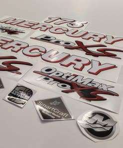 Conjunto de calcomanías de repuesto del mercado de accesorios hecho para adaptarse a los motores fuera de borda de Mercury. Impreso digitalmente en lámina polimérica y laminado. Resistente al calor, frío, humedad, aceite, rayos UV. Esta no es una calcomanía OEM, es una reproducción similar a la original. Puede diferir del original en color, tamaño o forma; Hecho en la UE.