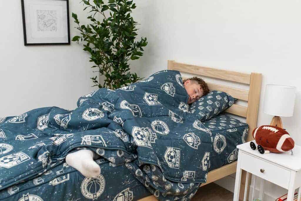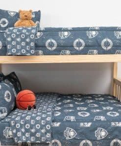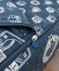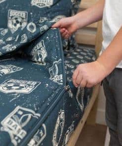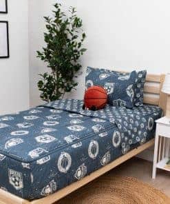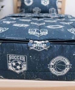 Conjunto de cama con temática deportiva para niños Beddy’s en azul. Nuestra ropa de cama con cremallera Nod & Winks es todo lo que necesitas para la habitación de tus hijos. Viene en una sola pieza y se coloca como una sábana ajustada, lo que hace que hacer la cama sea una tarea sencilla. El set incluye un edredón con diseños de béisbol, fútbol, baloncesto y fútbol, una sábana cosida, paneles de confort extendidos, funda de almohada ajustada y almohadón.
