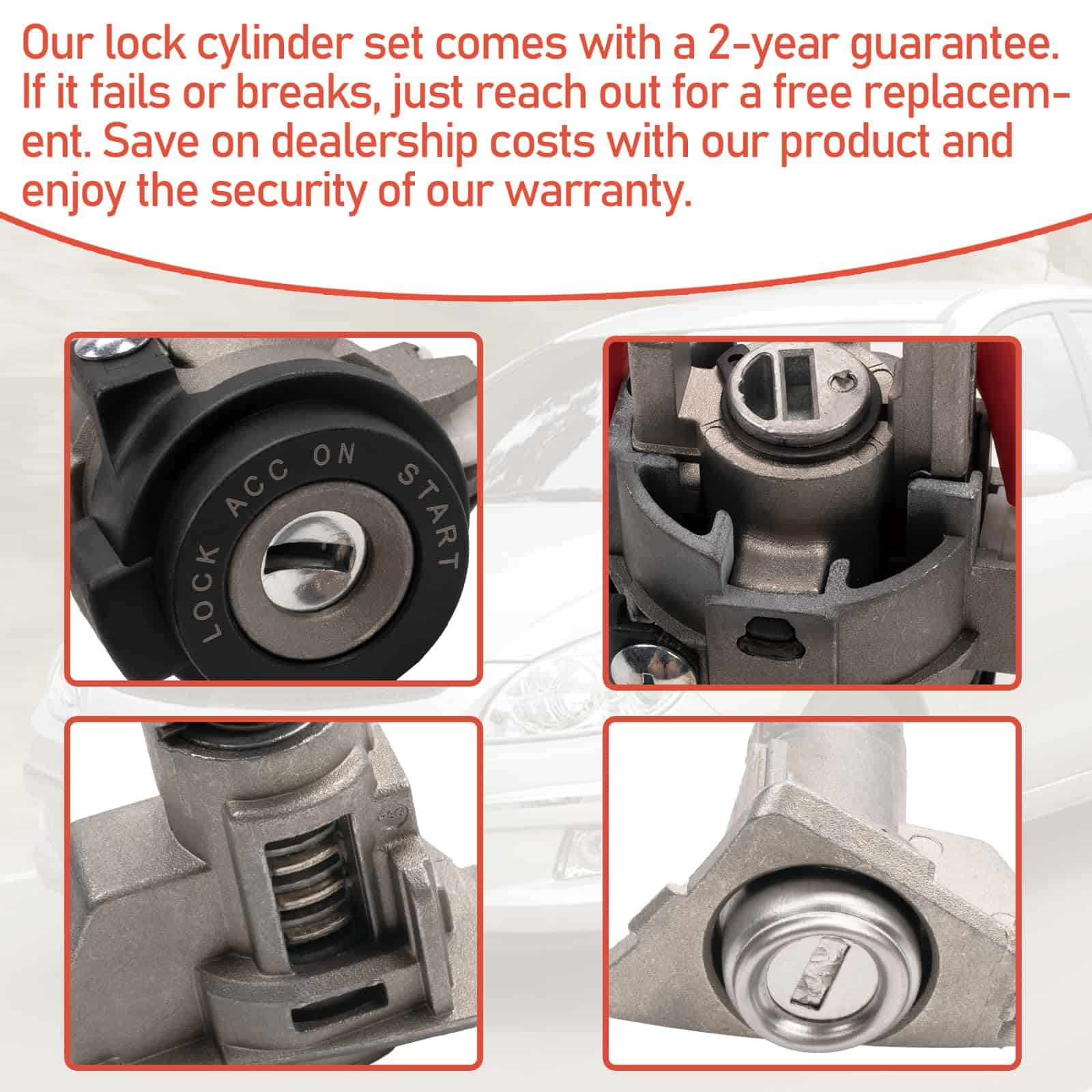 Nuestro juego de cilindro de bloqueo de encendido viene con una garantía de 2 años. Si falla o se rompe, simplemente pida una reposición gratuita. Ahorre en costos de concesionario con nuestro producto y disfrute de la seguridad de nuestra garantía. Garantizamos calidad superior y satisfacción de precio