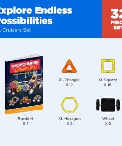Construye tu coche de ensueño con el Conjunto de Coches XL Cruiser. Crea coches rápidos y coloridos que son duraderos y divertidos de jugar. Las piezas especiales con bordes plateados mejoran tus diseños y dan a todos tus modelos un aspecto súper aerodinámico. Incluye 16 cuadrados, 12 triángulos, 2 hexágonos y 2 juegos de ruedas. Este es un conjunto perfecto para iniciarse en la construcción de coches. Solo se utilizan los mejores materiales, plástico ABS de alta calidad y un imán de neodimio de 1/3″ en el lado de la forma.