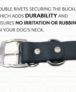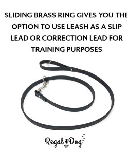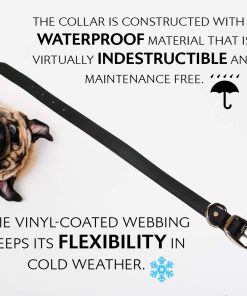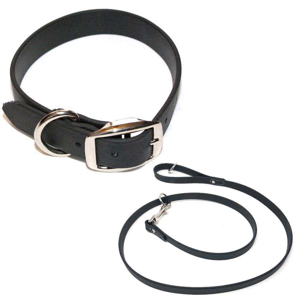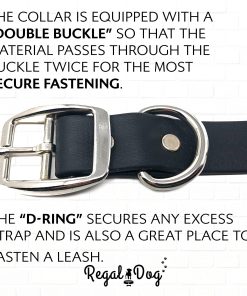 Conjunto de collar y correa para perro completamente impermeable, hecho a mano y ajustable para adaptarse a diferentes tamaños de cuello. Este collar para perros resistente a mordeduras es prácticamente indestructible gracias a su doble hebilla resistente a la corrosión y anillo en D para sujetar arneses, correas, placas de identificación y tarjetas de identificación. La correa de vinilo recubierto mantiene la flexibilidad del conjunto incluso en climas fríos, resistiendo hasta -20 grados Fahrenheit. Ideal para perros activos que disfrutan del agua o la caza. Fabricado con un material sintético que se asemeja al cuero pero es mucho más duradero, de fácil mantenimiento y fácil de limpiar con una esponja húmeda. Orgullosamente fabricado por Regal Dog Products, una empresa especializada en suministros para perros, accesorios y collares para mascotas.