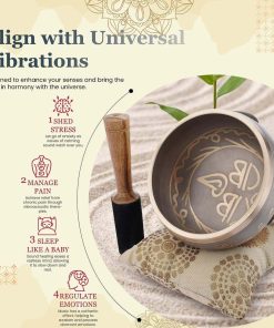 El Cuenco Tibetano Budista Ajuny es una herramienta de meditación bellamente diseñada de 4 pulgadas que presenta el impresionante diseño OM beige inspirado en los Ojos de Buda. Este exquisito cuenco combina arte y funcionalidad, produciendo tonos hipnóticos y pulsantes que promueven el alivio del estrés, la relajación profunda y la energía positiva. Compacto y portátil con un diámetro de 4 pulgadas y una profundidad de 2.25 pulgadas, es fácil de usar en cualquier lugar, lo que lo hace perfecto para la meditación, el yoga o la terapia de sonido. El set incluye un palo golpeador para crear sonidos tipo campana relajantes y un cojín de brocado para un soporte estable. Al golpear el cuenco y girar el borde en sentido horario, puedes crear vibraciones resonantes que repelen la energía negativa y fomentan la tranquilidad y armonía. Ideal para mejorar las prácticas de meditación, el Cuenco Tibetano Budista Ajuny es tanto una herramienta poderosa para lograr una mente y cuerpo en paz como una adición cautivadora a tu espacio de meditación.