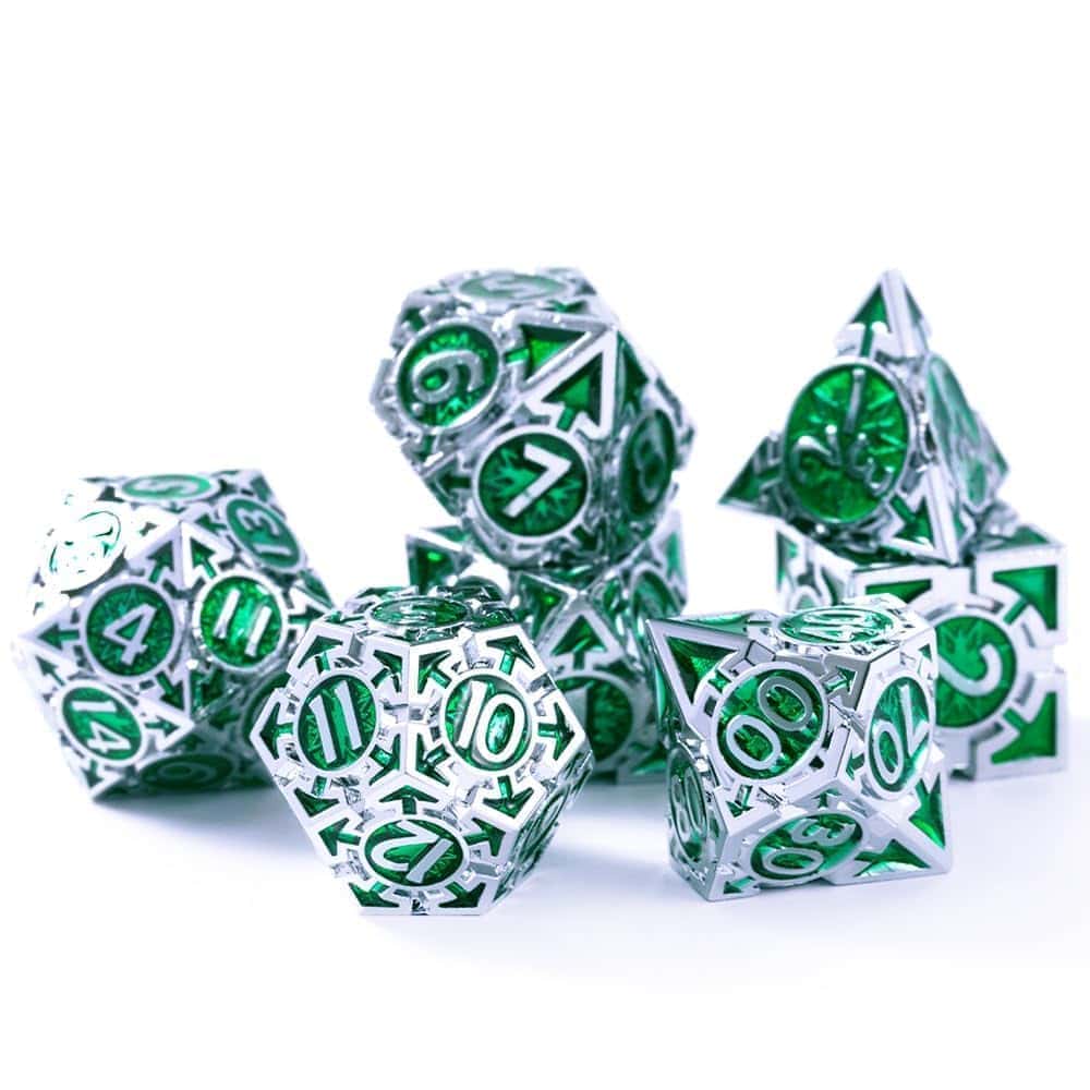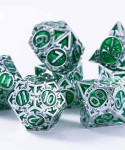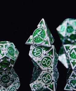 Este es un conjunto muy raro de dados de DND cromados, que son escasos debido a su difícil proceso de fabricación y fotografía. Estos dados son adecuados para casi cualquier juego de rol y son aptos para personas de todas las edades y géneros. Debido a que el conjunto de dados es blanco, los arañazos son más notorios; por lo tanto, debe usarse con una base de dados al usarlo, y debe guardarse nuevamente en la lata de embalaje de los dados cuando no esté en uso.