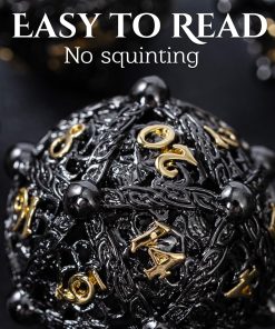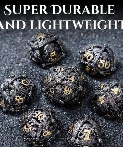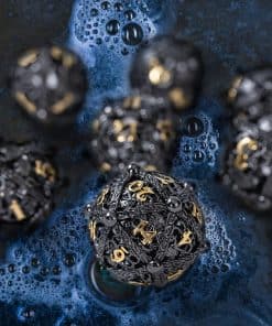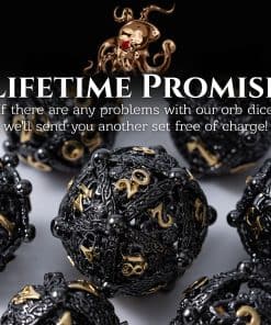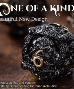 Conjunto de dados de metal Cthulhu negros y dorados para juegos de rol que harán que tus aventuras sean más emocionantes. Nuestros únicos dados huecos redondos fueron diseñados para rodar mejor y ofrecer una experiencia de juego incomparable. El diseño detallado es fascinante y los números claros hacen que sea fácil leer el resultado de tu lanzamiento. Su peso y tamaño perfectos los hacen cómodos de manejar y les dan un sonido agradable al chocar. La bolsa de dados incluida te permite llevar tus orbes contigo a todas partes de forma segura y añade un toque de elegancia al conjunto. ¡Haz que tus partidas de DnD sean aún más memorables con estos dados de calidad de Soar Forge!