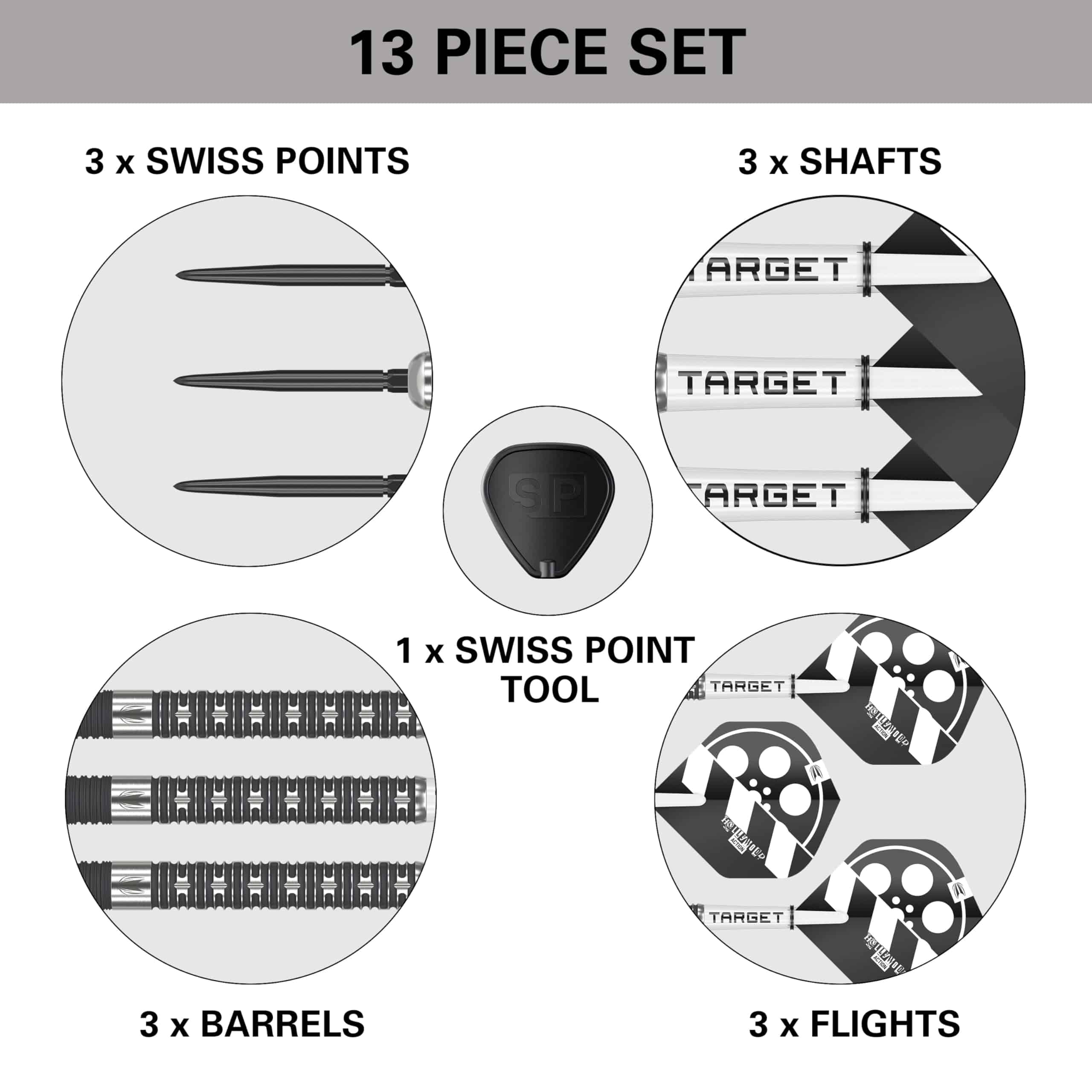 Creados en colaboración con el Campeón del Mundo de Maestros de PDC 2023, Chris Dobey, la gama de dardos de Edición de Jugador «Hollywood Action». El barril meticulosamente elaborado de Tungsteno del 90% logra el equilibrio perfecto entre peso y delgadeza para una precisión inigualable y control del dardo. Experimentando un viaje transformador, el barril de 50.1mm presenta ranuras radiales y fresado por CNC, con un recubrimiento de nitruro de titanio negro resistente, asegurando durabilidad para las exigencias del juego competitivo. La adición de ranuras re-maquinadas y arenadas introduce una estética elegante y de alto rendimiento, estableciendo estos dardos como una verdadera elección del jugador. Experimenta la innovación con la Tecnología de Punto Suizo Negro de 26mm. Este sistema único de Punta Suiza cuenta con un mecanismo de bloqueo patentado, permitiendo el intercambio sin esfuerzo de puntos de dardo. La tecnología de cono y rosca proporciona una posición segura y bloqueada, entregando estabilidad y precisión en cada lanzamiento. Añadiendo a la estética del dardo con un Eje de Agarre Tag Pro corto en blanco prístino (34mm), especialmente moldeado en un compuesto de nylon formulado especialmente, mejorando la durabilidad. Completado con una Pluma Hollywood Action Pro Ultra No.2, inspirada en la esencia misma de su nombre. Elaboradas con una impresión UV spot, estas plumas mejoran el agarre pluma-eje, ofreciendo una durabilidad excepcional con su material de 100 micrones. Redefine tu experiencia de dardos con esta gama de dardos Hollywood Action Chris Dobey respaldada por jugadores. Disponible en 3 opciones de peso: 22g (Diámetro: 6.45mm), 23g (Diámetro: 6.6mm) y 24g (Diámetro: 6.7mm). Qué Incluye: 3x Barriles Hollywood Action de 90% de Tungsteno (longitud: 50.1mm), 3x Punta Suiza Negra de 26mm, 3x Ejes de Agarre Tag Pro (34mm), 3x Plumas Hollywood Action Pro Ultra No.2, y 1x Herramienta Swiss Point.