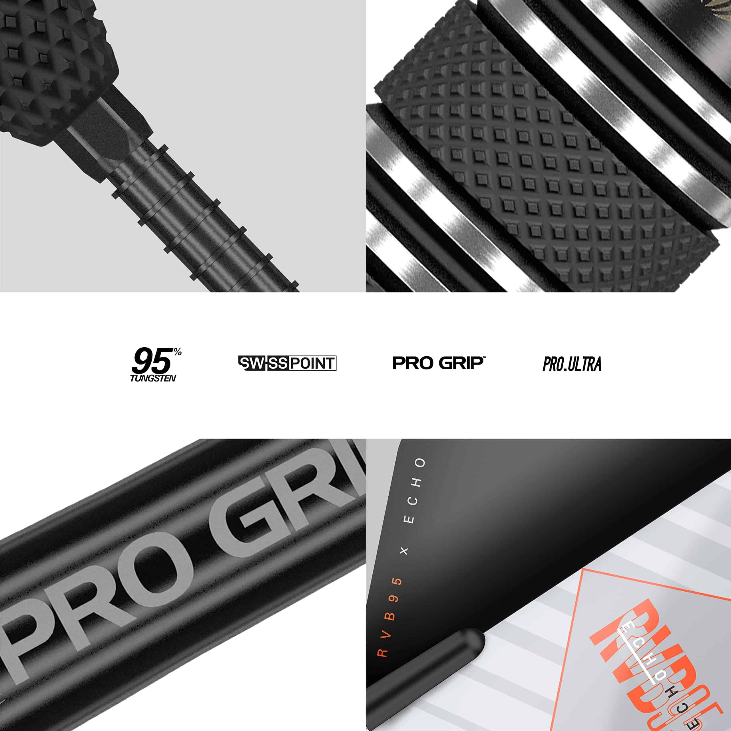 Player endorsed and used by 5 time World Champion Raymond van Barneveld – The RVB Echo a collaboration between two brands – RVB x Echo 95% Tungsten Swiss Point Tip Steel tip 23 Gram Weight. Precision Milled Barrel Design – (47mm Barrel Length, 7mm Barrel Diameter) Taking key elements from both the Echo range and the RVB G4 this dart range encompasses multiple grip profiles, contrasting colour schemes and performance coatings throughout creating an elegant range. The barrel itself features 3 grip profiles, Precision Milling at the front, classic Knurling in the middle and at the rear radial grooves. Swiss Point Technology – 26mm Black Firepoint – Switch your point length, style and colour in seconds using the patented locking system using taper and threaded technology ensures your points stay locked in during play. Stylish Design – The range is completed with Black Pro Grip shaft exclusive to RVB x Echo and signature RVB x Echo flights incorporating the black and dark grey themes from the Echo. Pack Contains – 3 x Dart Barrels, 3 x Short Black Pro Grip Shafts, 3 x RVB x Echo Designed No.6 Flights, 3 x 26mm Black Firepoint Swiss Points.