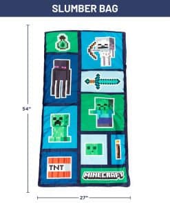 Diseñado especialmente para los más pequeños, este conjunto de descanso de Minecraft con almohada y antifaz adicional será el centro de atención en la próxima pijamada. Tu hijo podrá llevar su increíble aventura de dormir a cualquier lugar. La cremallera lateral de esta bolsa de dormir facilita la entrada y salida. Este set de descanso de 3 piezas de Minecraft es ideal para pijamadas, ver televisión, la hora de la siesta y mucho más. La bolsa de dormir cuenta con tu personaje favorito de Minecraft, Creeper. Incluye (1) bolsa de dormir suave al tacto, (1) almohada de peluche y (1) antifaz. Dimensiones: Bolsa de dormir 27″ x 54″, Almohada 11″ x 17″. Es un excelente regalo. Para uso en interiores solamente.