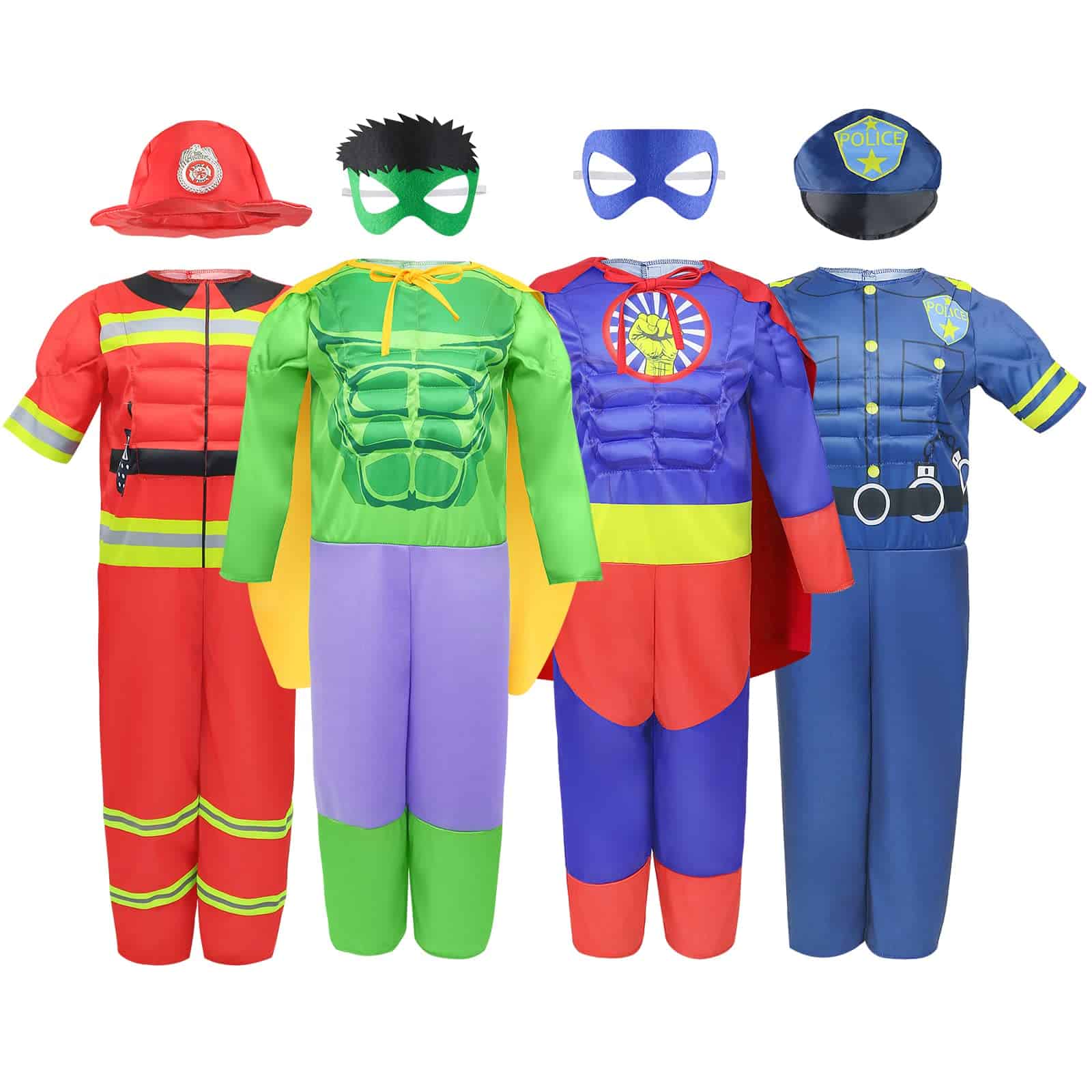 4. Set de ropa de disfraz para niños: Un tronco único con disfraces de roles profesionales y de héroes al mismo tiempo. Más opciones y felicidad. El set de ropa de disfraz es adecuado para el juego de roles de chicos, Halloween, Navidad, Mardi Gras, Pascua, actuaciones en el escenario, juegos imaginativos, cumpleaños y otras fiestas temáticas.