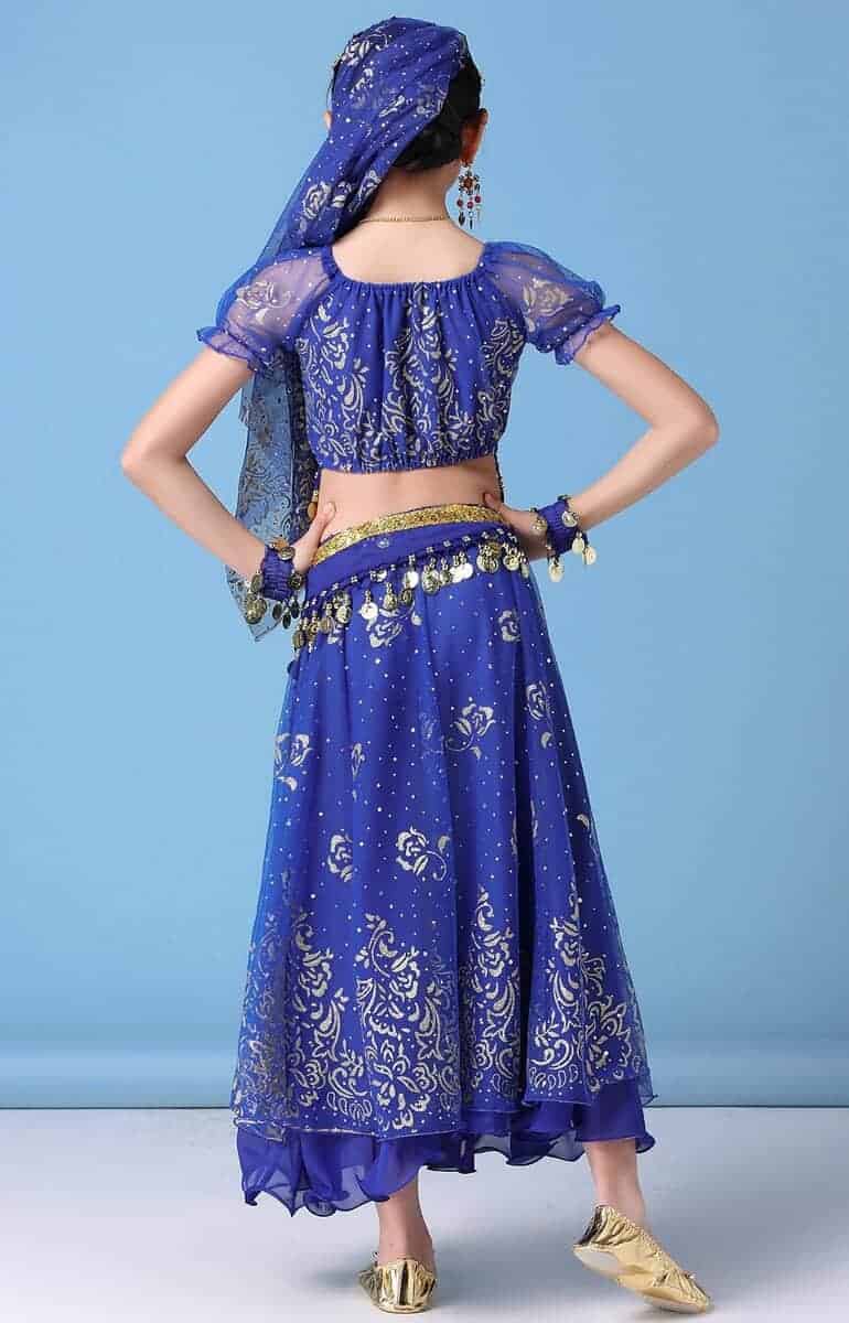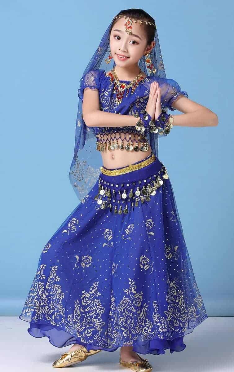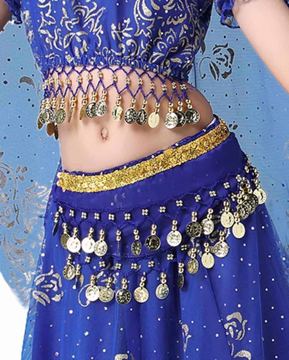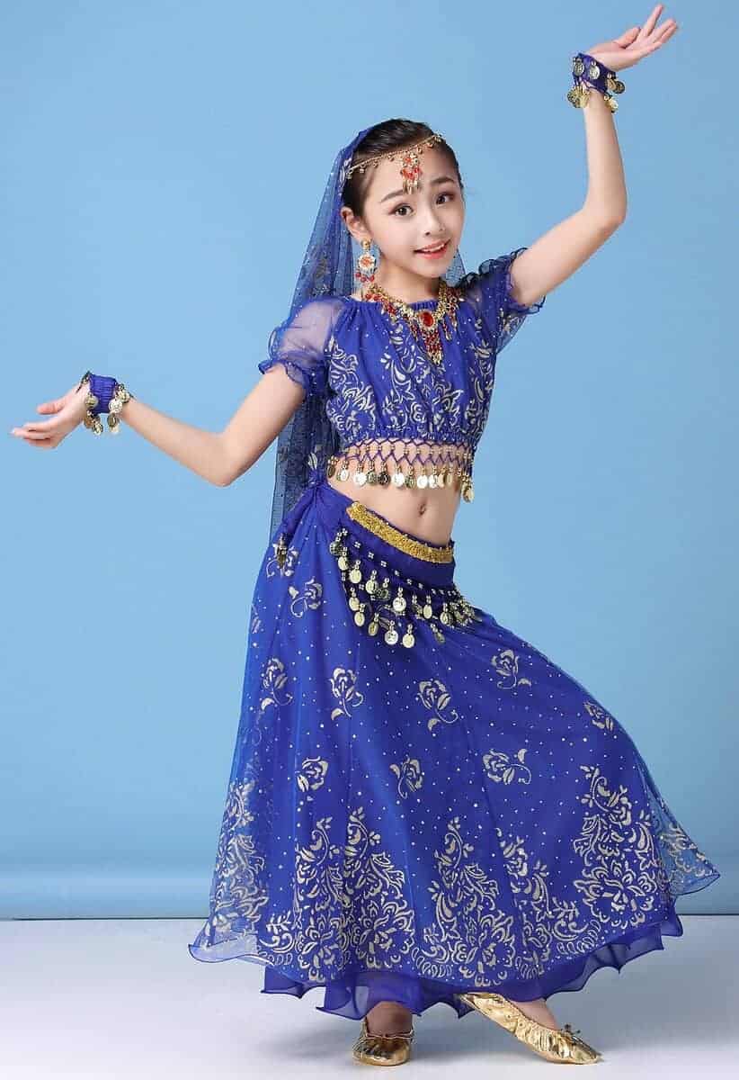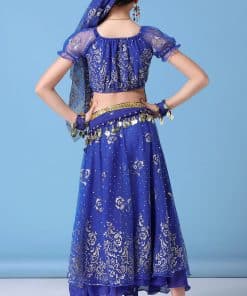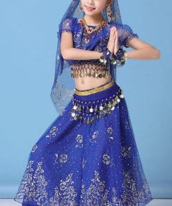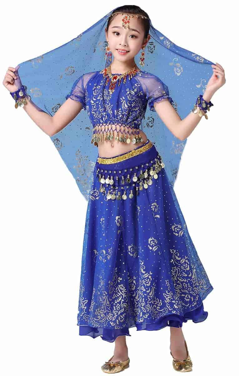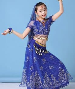 Conjunto de disfraz de danza del vientre para niñas ORIDOOR que incluye una falda fruncida, perfecto para actuaciones de Halloween o danzas indias. El traje está hecho de Spandex y Chiffon 120D, lo que lo hace transpirable, amigable con la piel y resistente a las arrugas. La parte superior de chiffon 120D tiene una impresión dorada exquisita, la cintura presenta un diseño de campana con monedas de metal, y la gran falda tiene una impresión elegante y opaca. El set incluye una parte superior de danza del vientre, una falda doble de danza del vientre, un cinturón de danza del vientre, una cadena para la cabeza y un velo. Asegúrate de consultar nuestra tabla de tallas para seleccionar la talla correcta. Este disfraz versátil también se puede utilizar como disfraz de danza india, disfraz de gitana o disfraz de danza del vientre egipcia.