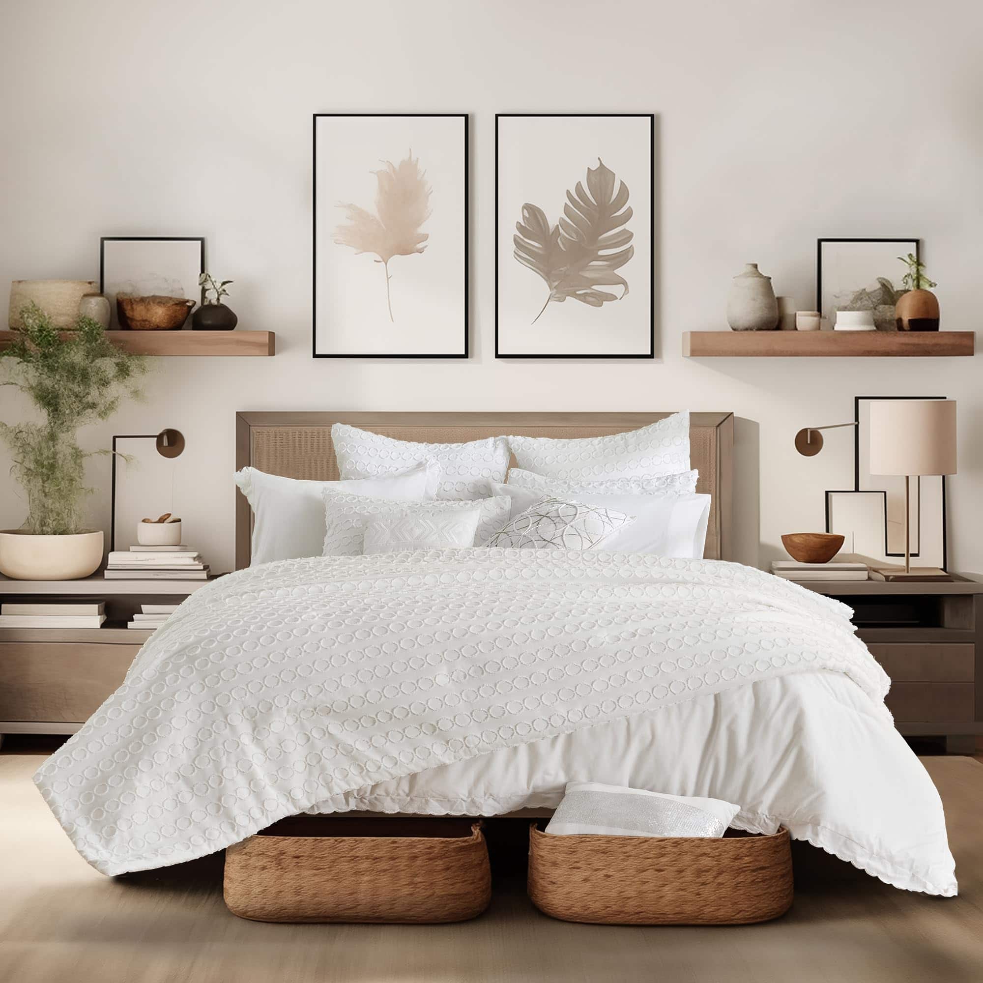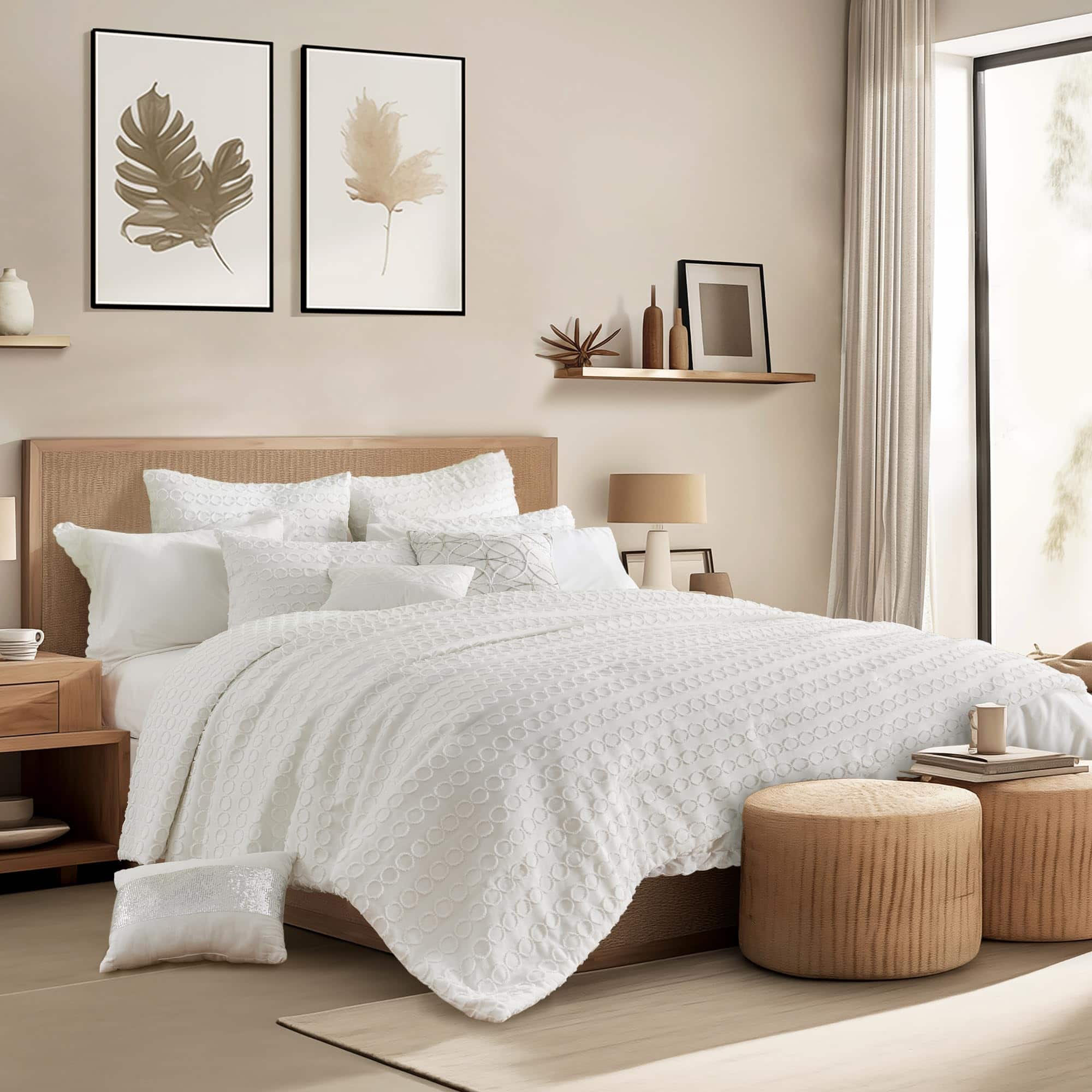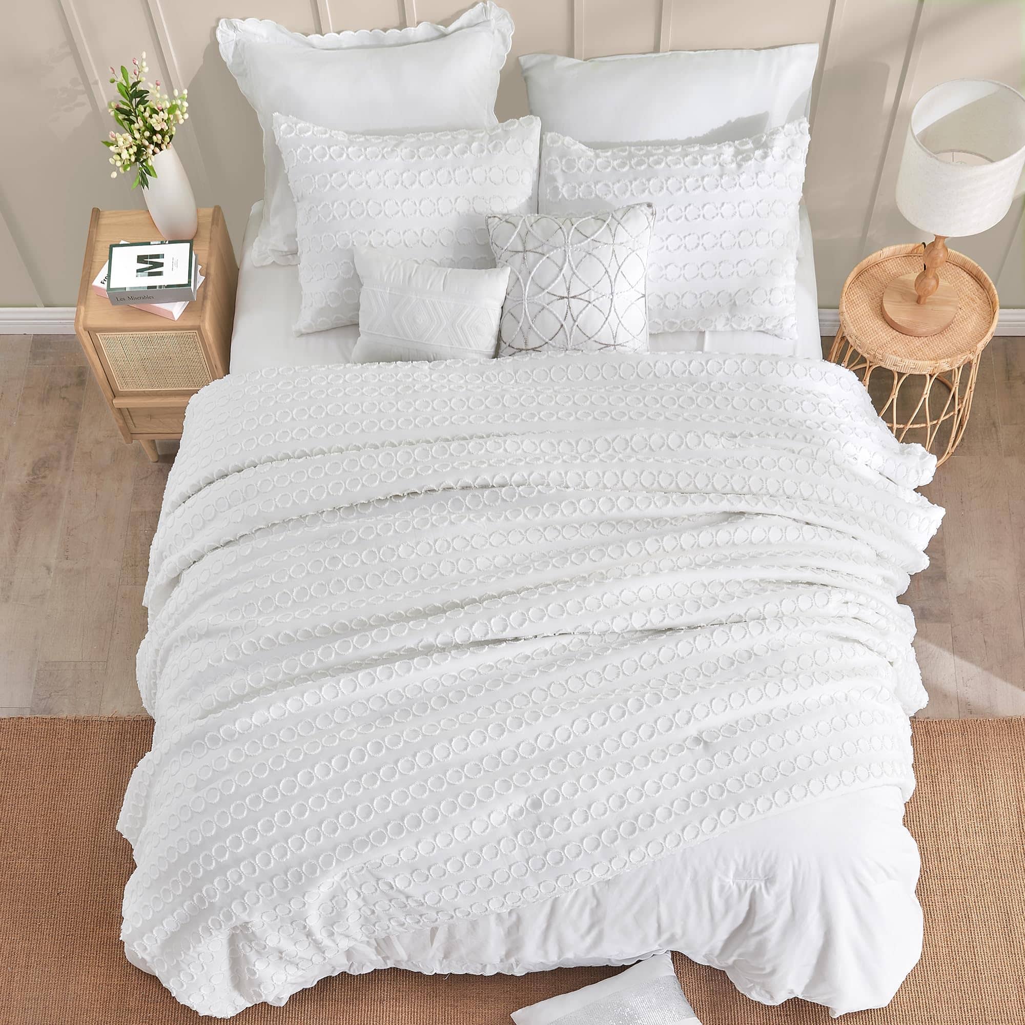 Nuestro maravilloso juego de edredón blanco con jacquard pespunteado está diseñado para proporcionar un confort excepcional durante todo el año. Fabricado con tela suave de microfibra en el frente y tela cepillada súper suave en la parte posterior, este edredón es amigable con la piel y transpirable, manteniéndote fresco y cómodo en todas las estaciones. El diseño de jacquard pespunteado con círculos simples agrega un toque refrescante y visualmente atractivo a tu dormitorio, y es versátil para combinar con diferentes estilos de decoración. El juego incluye 8 piezas, con tamaños disponibles para Queen y King, y es fácil de cuidar ya que es lavable a máquina. Disfruta de la suavidad, confort y estilo que este conjunto de edredón te brinda.