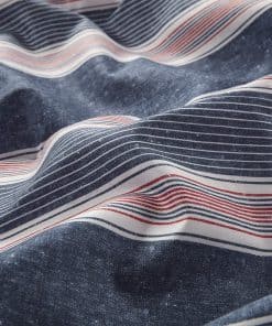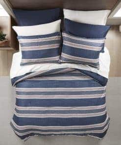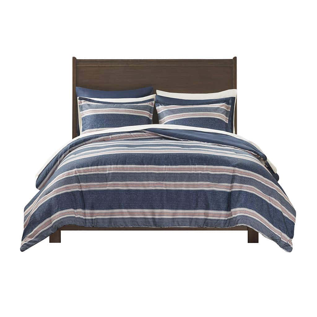 El conjunto de cama Comfort Spaces Wallace ofrece una actualización suave y casual para combinar con la decoración de tu dormitorio y es una elección perfecta para la habitación de un chico. El edredón presenta rayas en azul marino, azul, rojo y blanco roto para un aspecto suave y atractivo, mientras que un color sólido en azul marino en el reverso complementa la parte superior de la cama para completar el look. Las fundas a juego también reiteran los diseños del edredón. También se incluye un set de sábanas completo en blanco roto que presenta una sábana ajustable con un bolsillo lateral en cada lado para almacenamiento adicional junto a la cama. SERVICIO: Si no amas absolutamente este producto, devuélvelo en un plazo de 30 días para un reembolso completo. Trabajaremos contigo para resolver cualquier problema y asegurarnos de que estés satisfecho con tu experiencia.