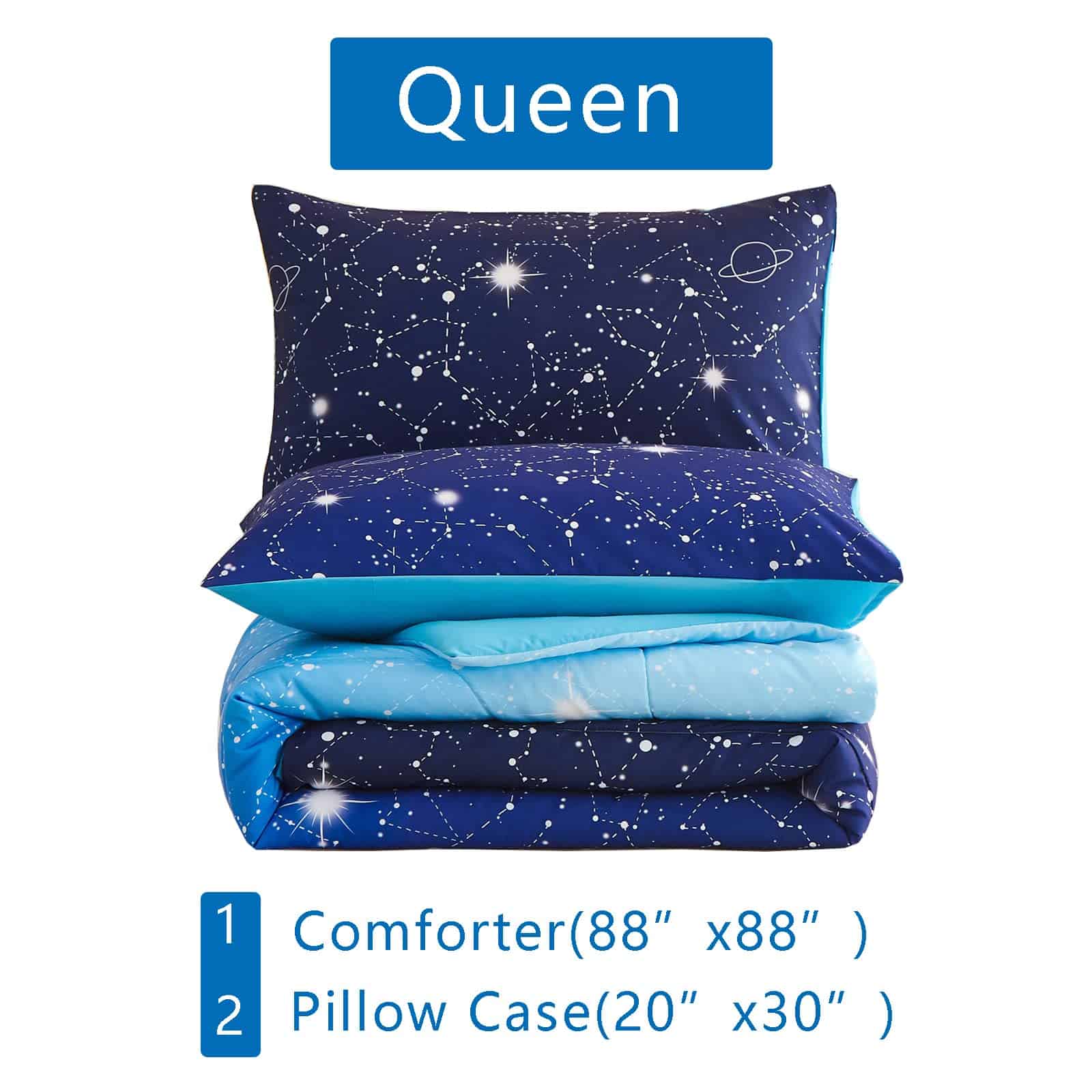 Tamaños disponibles de nuestro juego de edredón de galaxia azul centelleante 1. Juego de 2 piezas Twin: 1 edredón azul brillante tamaño twin (68 x 88), 1 funda de almohada (20 x 30). 2. Juego de 3 piezas Queen: 1 edredón azul brillante tamaño queen (88 x 88), 2 fundas de almohada (20 x 30).