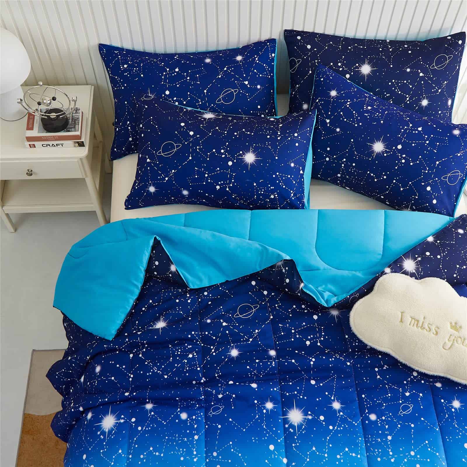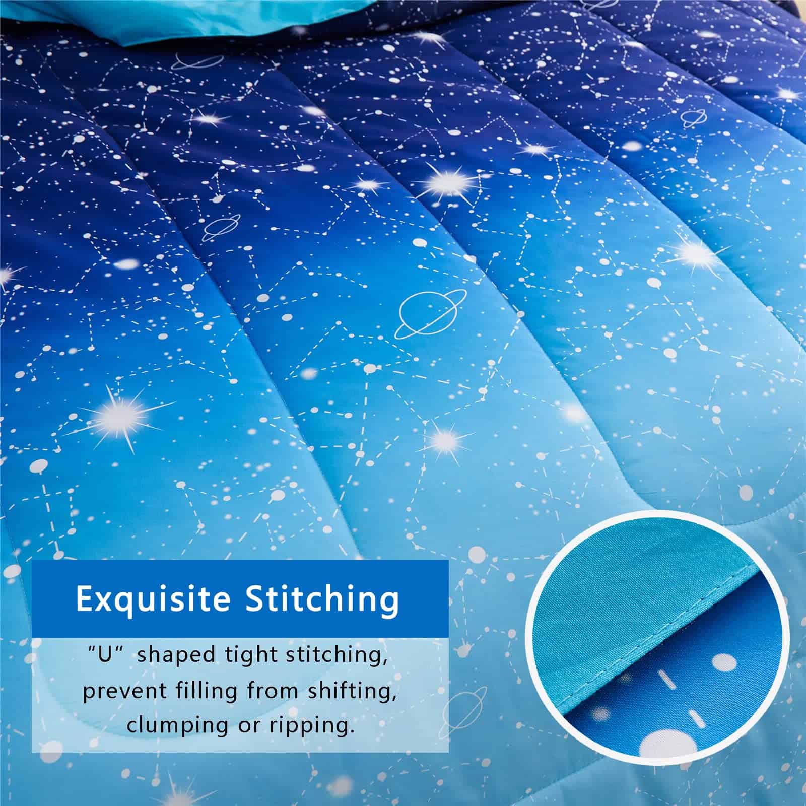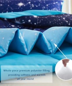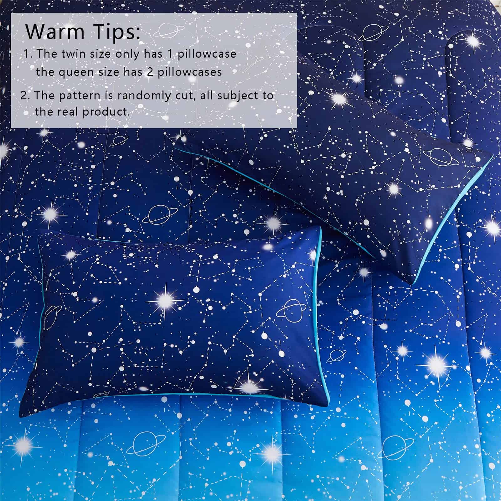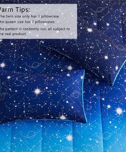 ¿Por qué elegir el juego de edredón Blue Ombre Galaxy? 1. Diseño único con colores azules degradados y galaxia centelleante, constelación, estrellas parpadeantes, creando una gran diversión de color para tus niños. 2. Microfibra de poliéster premium respetuosa con la piel, brindando comodidad agradable para tu pequeño, hace que tus hijos duerman cómodos y en paz toda la noche. 3. Excelente elección como regalos para tu hijo, hija, amigos, novio en cumpleaños, Día de Acción de Gracias, Navidad y Día de San Valentín.