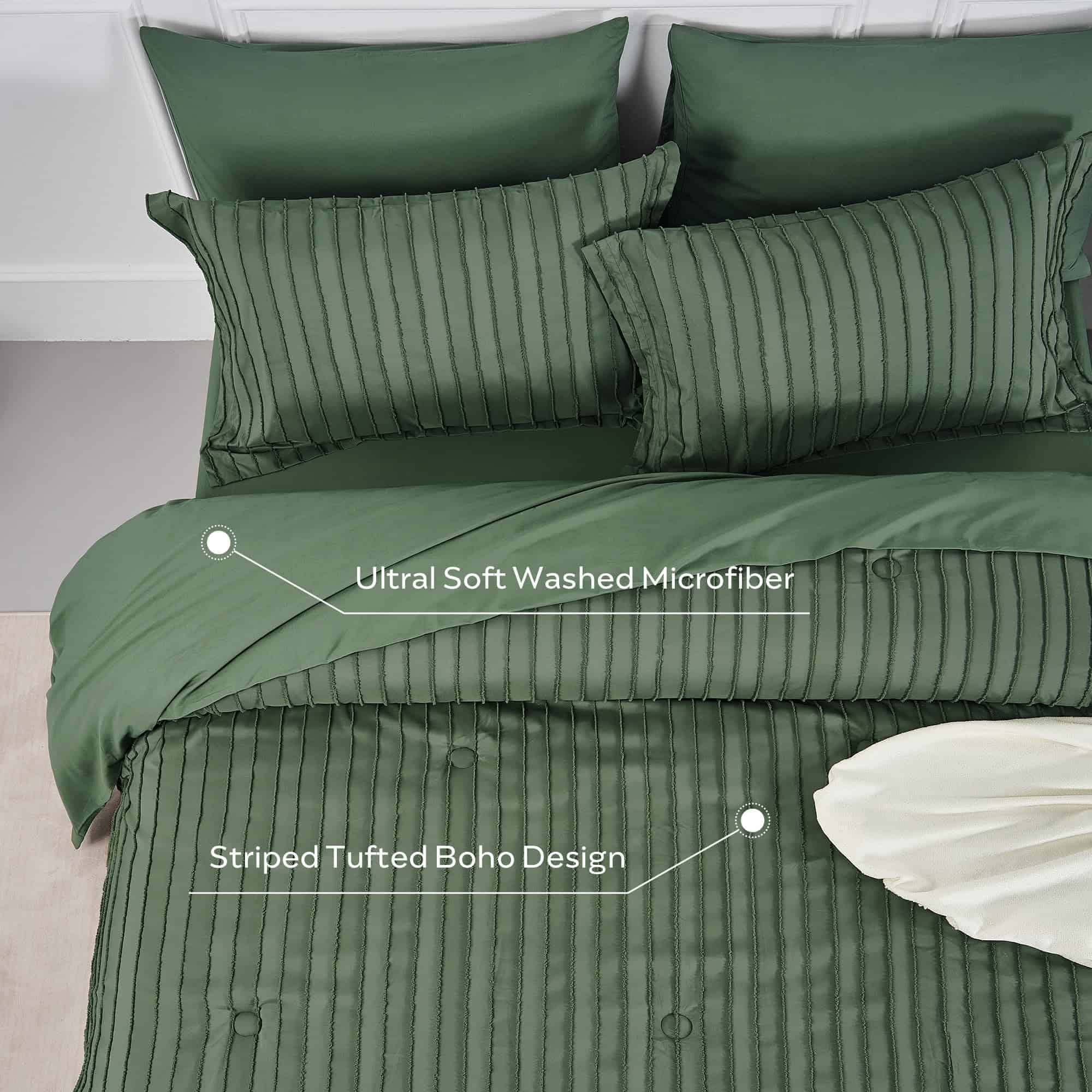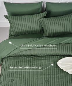 Conjunto de edredón king Jellymoni en verde con rayas acolchadas y diseño jacquard. Este juego de cama premium está hecho de microfibra lavada para ofrecer suavidad, transpirabilidad y ligereza para un descanso óptimo. El relleno de microfibra alternativa ultra suave del edredón es ideal para aquellos con alergias. El diseño de rayas jacquard agrega un toque bohemio para embellecer la decoración de tu dormitorio. El juego incluye ocho lazos en las esquinas para un ajuste seguro y un pespunte circular que garantiza que el relleno se mantenga estable y transpirable en cada lavado. La ropa de cama es lavable a máquina para un mantenimiento sencillo. Simplemente lávalo en un ciclo suave con agua fría y sécalo en secadora a baja temperatura. El embalaje al vacío garantiza que el producto llegue en perfectas condiciones, listo para usar con un suave mullido. En Jellymoni, nos preocupamos por ofrecer productos de alta calidad con estilo para asegurar una experiencia de sueño tranquila. Además, ofrecemos una política de devolución de 30 días y un soporte al cliente rápido en 24 horas. El conjunto de edredón King Jellymoni incluye 1 edredón (102″ x 90″) y 2 fundas de almohada (20″ x 36″ + 2″) para una experiencia de sueño completa.