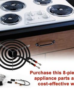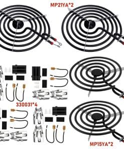Conjunto de Elemento de Quemador de Rango Eléctrico MP22YA, 2 unidades MP15YA de 6 pulgadas y 2 unidades MP21YA de 8 pulgadas, 4x Kit de Receptáculo de Elemento Superficial 330031. Especificaciones de MP15YA: 6 pulgadas, 1500 vatios, 230 voltios, 4 vueltas; Especificaciones de MP21YA: 8 pulgadas, 2100 vatios, 230 voltios, 5 vueltas. Tiene un soporte en forma de «Y». Kit de Receptáculo de Elemento Superficial 330031. Modelos Reemplazables: MP15YA — Reemplaza la Parte: WPW10259868 (o W10259868), WPY04100165, Y707456, Y703422, Y0E00601299, MP15MA, MP12MA, 0E00601299, Y04100165, AP6024130, PS11757480, EAP11757480, PD00003241, 7406P048-60, 74005446, 715927, 707456, 703422, 7-7456, 7-3422, 7-15927, 550071, 5-50071, 4381748, 19950010, 15927, 1242501, 04100165. MP21YA — Reemplaza la Parte: WPW10259865 (o W10259865), WPY04100166, Y0E00801799, 0E00801799, SU306, MP26YA, MP26M, MP21U, MP21MA, 7406P050-60, Y04100166, AP6024131, PS11757481, EAP11757481, PD00003012, 4381750, 400178, 19950009, 1938-344, 1938-249, 15928, 04100166, 74005447, 715928, 715928, 707457, 707457, 7-7457, 7-15928, 550072, 550072, 5-50072, 1242502. Kit de Receptáculo de Quemador de Rango 330031: W11396691 (o W10279107), 5303935058, 814399, AP3075808, 14200040, AH340571, B5015402, EA340571, FSP330031, PS340571, W10116799, W10116803, W10841094, 3374, EAP340571