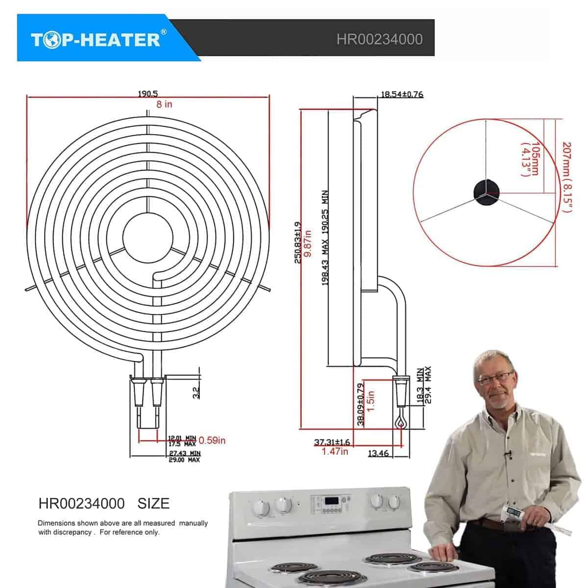 5. LO QUE OBTIENE 2 elementos de quemador de rango eléctrico MP15YA de 6″ – 4 vueltas – 208V/1130W, 240V/1500W, 2 elementos de quemador de estufa eléctrica MP21YA de 8″ – 5 vueltas – 208V/1575W, 240V/2100W. Por favor, verifique las dimensiones mostradas en la imagen para asegurarse de que el elemento de quemador de rango se ajuste a su estufa eléctrica. Si no está seguro, no dude en enviarnos un correo electrónico para confirmar la compatibilidad. Le responderemos en el primer momento