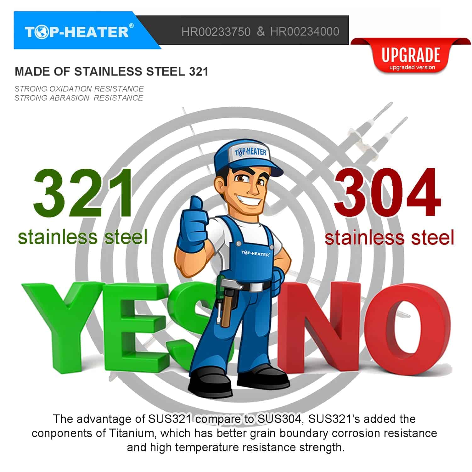 2. MATERIAL MP15YA 6″ y MP21YA 8″ los elementos de quemador de rango eléctrico están hechos de acero inoxidable 321. En comparación con el acero inoxidable 304, el acero inoxidable 321 tiene una resistencia a temperaturas más altas, mayor resistencia a la oxidación, mejor resistencia al desgaste y una menor deformación durante el funcionamiento de los quemadores de la estufa.