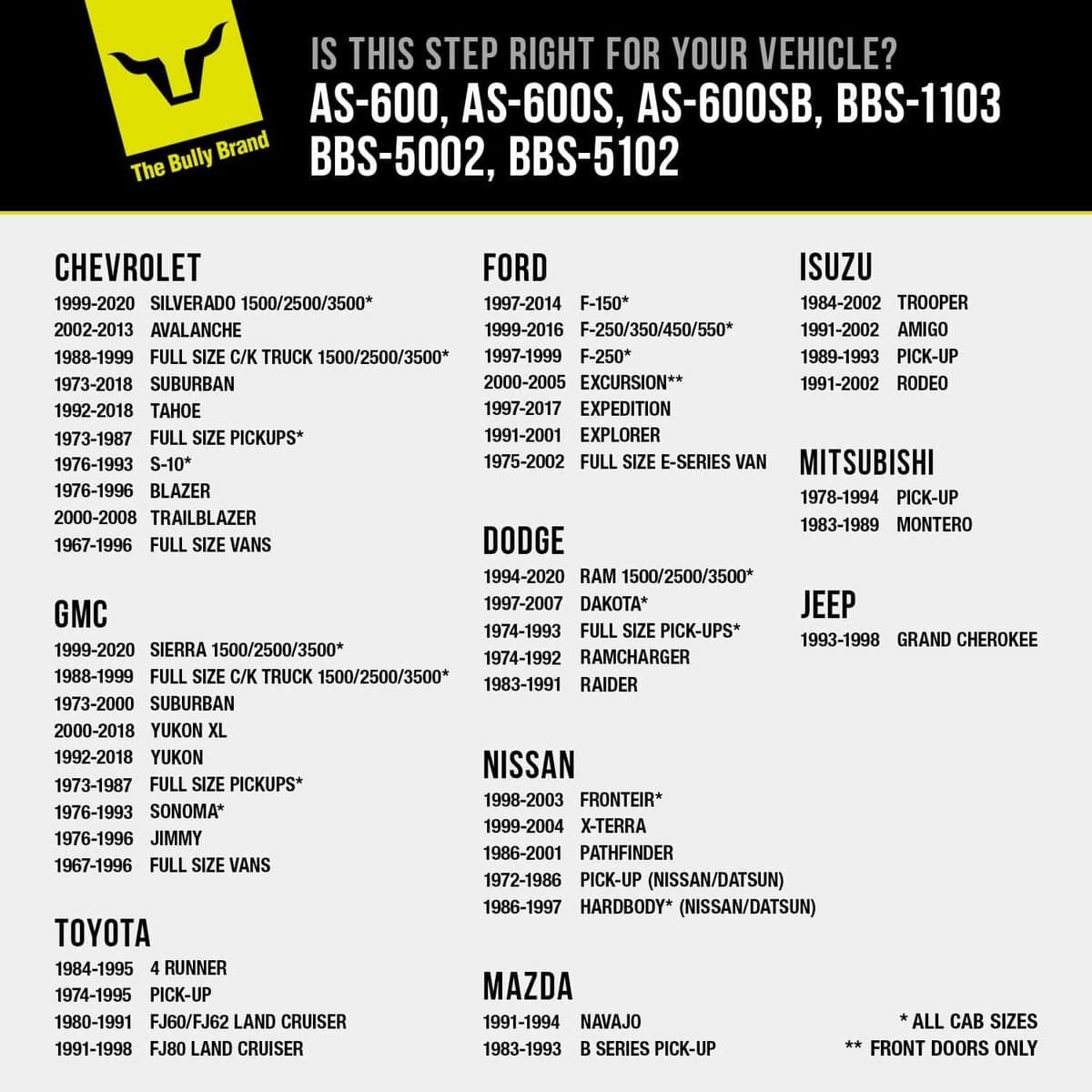 Bully Black Bull Aluminum Side Step garantiza una entrada y salida segura y conveniente en un camión o SUV. Es una actualización práctica y asequible para los vehículos. Para la mayoría de los dueños de camiones y SUV, agregar un estribo lateral es a menudo su primera modificación para su camión y/o SUV. El estribo lateral está construido en aluminio fundido de una sola pieza que es resistente a la corrosión, prolongando así la vida útil y durabilidad de los estribos laterales. El marco es ligero pero duradero y no agrega carga innecesaria al vehículo. Tiene un acabado mate que crea un atractivo universal y proporciona una superficie de paso antideslizante. Texturizado y extra profundo, este paso se puede acoplar a una amplia gama de camiones deportivos y SUV por Chevrolet, Dodge RAM, Ford, GMC y Toyota.