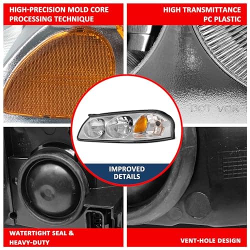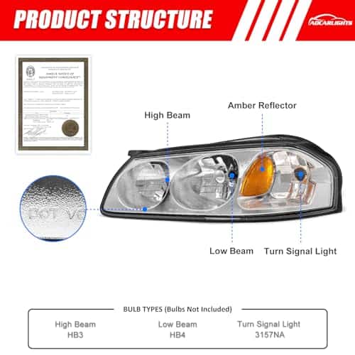 Con este Conjunto de Faros ADCARLIGHTS, obtendrá un ajuste perfecto para su Chevrolet Impala de los años 2000 a 2005. La carcasa cromada con reflector ámbar y lente clara le brinda un aspecto elegante y moderno a su vehículo. Gracias a la lente de PC de alta transmitancia con recubrimiento UV, disfrutará de una visión ultraclear y una durabilidad excepcional.