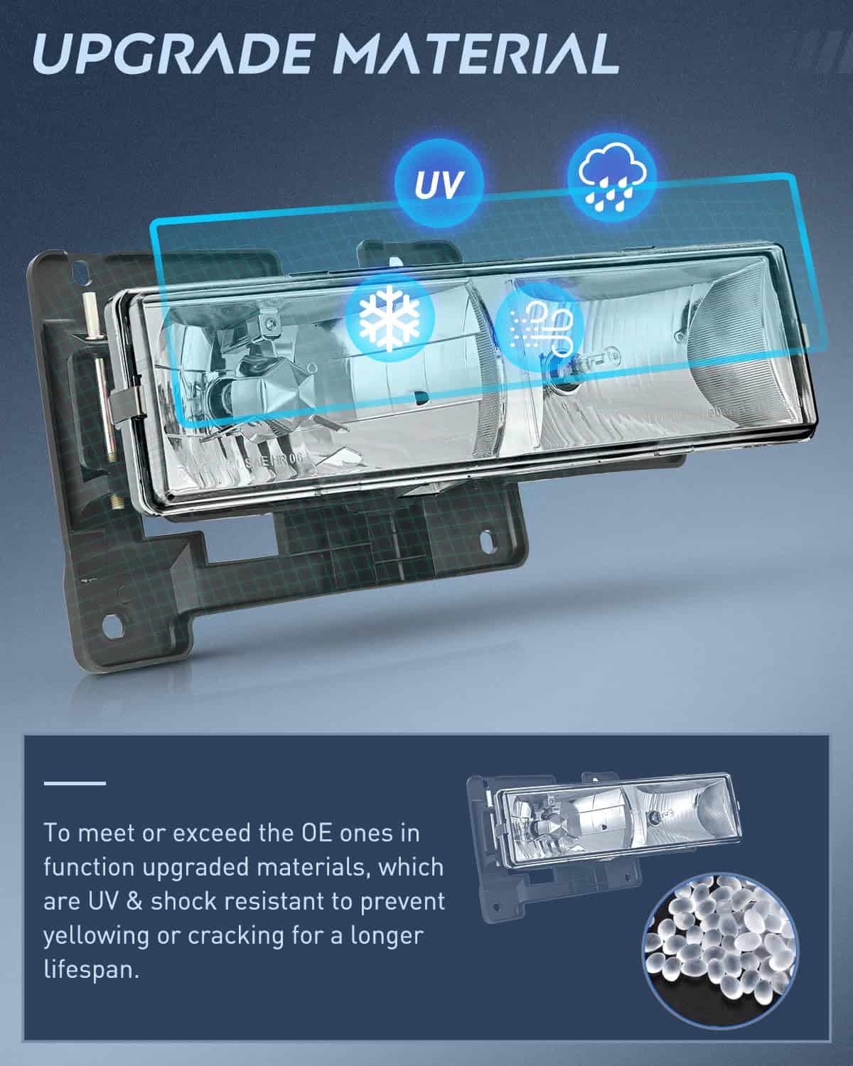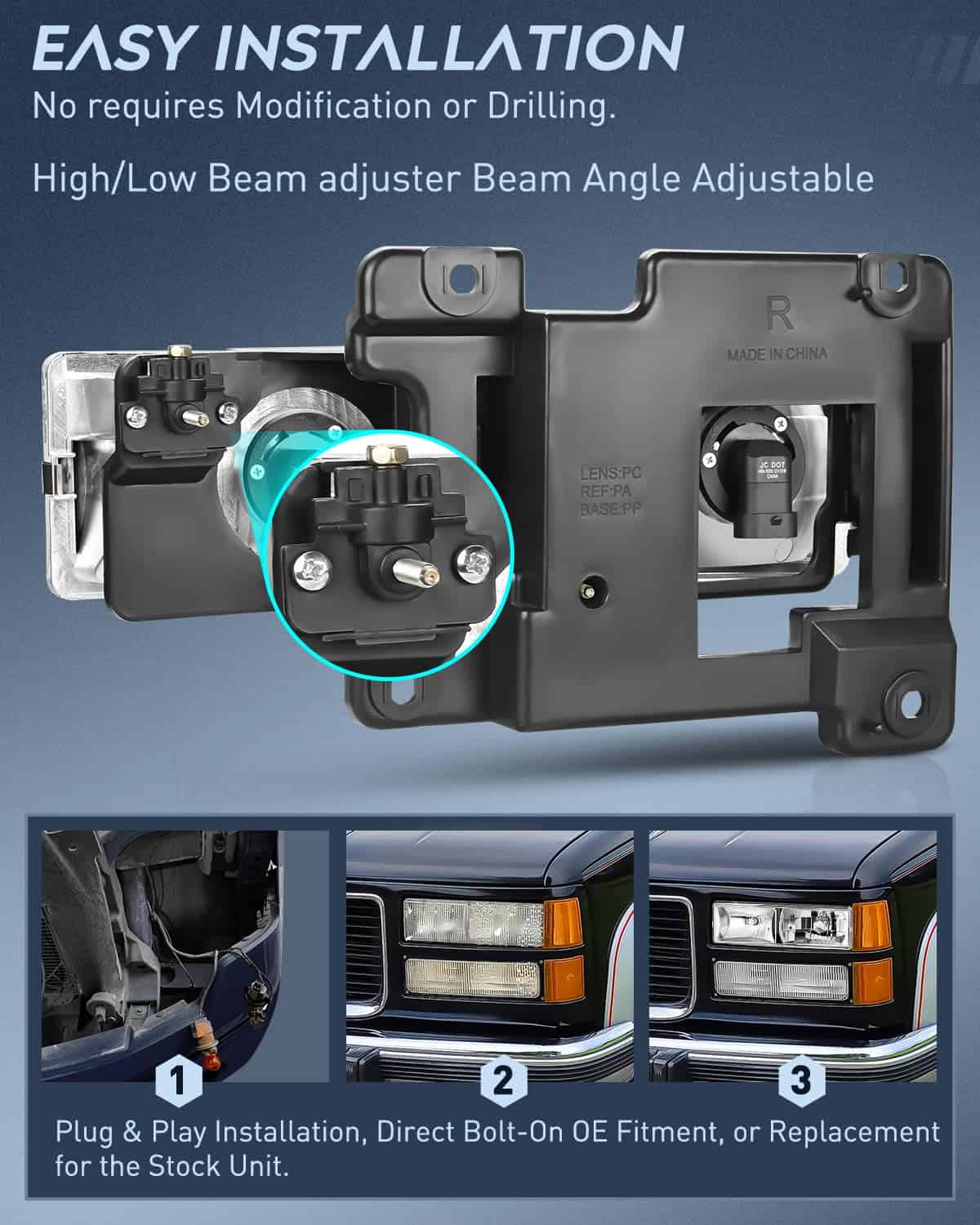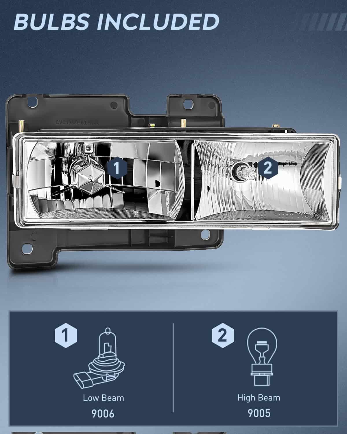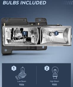 Compatibilidad: Los conjuntos de faros son compatibles con modelos de camiones de 1988-1998 GMC Sierra, 1988-1998 Chevrolet Silverado, 1988-1998 Chevrolet/GMC pick up C10, 1988-1998 camiones C/K 1500/2500/3500, modelos 1992-1994 Chevrolet Blazer (tamaño completo), 1994-1999 Chevrolet Tahoe, 1992-1999 GMC Yukon, Chevrolet/GMC Suburban 1992-1999. No apto para la versión de SELLO DE VIGA. Tipo de bombilla de luz alta: 9005 Tipo de bombilla de luz baja: 9006. Las bombillas están incluidas.